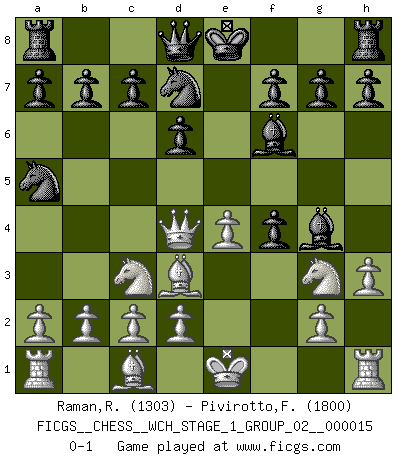Last move : 0-1 2015 October 12 13:14:13 [Event "FICGS__CHESS__WCH_STAGE_1_GROUP_02__000015"] [Site "FICGS"] [Date "2015.08.01"] [Round "1"] [White "Raman,Ranganathan"] [Black "Pivirotto,Filiberto"] [Result "0-1"] [WhiteElo "1303"] [BlackElo "1800"] 1.e4 e5 2.Nc3 Nf6 3.Qf3 Be7 4.Bc4 Nc6 5.Nge2 Na5 6.Bd3 d6 7.Ng3 Bg4 8.Qe3 Nd7 9.h3 Bg5 10.f4 exf4 11.Qd4 Bf6 0-1 This chess game has been lost on time (started : 2015.08.01 2:7:37) Vienna : Falkbeer variation Player Black won this chess game. Follow this game move after move (download)If I win a tournament, I win it by myself. I do the playing. Nobody helps me. (Bobby Fischer) Modernes Schach erfordert enorme Anspannung. Es ist für einen normalen Menschen unmöglich das auszuhalten. (Viktor Kortschnoi) Me dio la sensación de como si yo estuviera jugando en contra del mismo Ajedrez. - al estar jugando en contra de Robert Fischer (Walter Shipman) Il vaut mieux sacrifier les pièces de l'adversaire. (Xavier Tartacover) CHESS, n. f. [echecs, Fr.] A nice and abstruse game, in which two sets of puppets are moved in opposition to each other. (Dr Samuel Johnson, A Dictionary Of The English Language, 1755)
