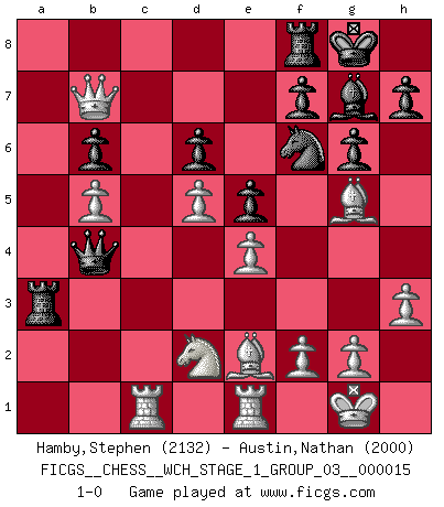 Last move : 1-0 2015 October 12 4:8:24 [Event "FICGS__CHESS__WCH_STAGE_1_GROUP_03__000015"] [Site "FICGS"] [Date "2015.07.02"] [Round "1"] [White "Hamby,Stephen"] [Black "Austin,Nathan"] [Result "1-0"] [WhiteElo "2132"] [BlackElo "2000"] 1.d4 Nf6 2.c4 g6 3.Nc3 Bg7 4.e4 d6 5.Nf3 O-O 6.Be2 e5 7.d5 a5 8.Bg5 Nbd7 9.Nd2 Nc5 10.O-O Bd7 11.b3 Rb8 12.a3 b6 13.b4 Nb7 14.Rc1 axb4 15.axb4 Ra8 16.Re1 Ra3 17.Qc2 Qa8 18.h3 Qa7 19.Nb5 Bxb5 20.cxb5 Qa4 21.Qxc7 Qxb4 22.Qxb7 1-0 King's Indian : Petrosian system, Stein variation Kingside Castling by player Black (move 5) Kingside Castling by player White (move 10) Player White won this chess game. Follow this game move after move (download)Though most people love to look at the games of the great attacking masters, some of the most successful players in history have been the quiet positional players. They slowly grind you down by taking away your space, tying up your pieces, and leaving you with virtually nothing to do ! (Yasser Seirawan) Sitze auf Deine Hände. (Siegbert Tarrasch) Después de la respuesta de las negras a 1.e4 con 1..e5, se quedan siempre tratando de entrar dentro del juego. (Howard Staunton) Comme les marins qui ont mille raisons différentes d'aller en mer, les joueurs d'échecs en ont tout autant avant de s'installer devant une table et jouer... (Vincent Bertignac, philosophe) Wisdom is the reward you get for a lifetime of listening when you'd have preferred to talk. (Doug Larson)