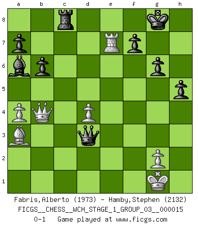 Last move : 0-1 2015 September 29 12:16:28 [Event "FICGS__CHESS__WCH_STAGE_1_GROUP_03__000015"] [Site "FICGS"] [Date "2015.07.02"] [Round "1"] [White "Fabris,Alberto"] [Black "Hamby,Stephen"] [Result "0-1"] [WhiteElo "1973"] [BlackElo "2132"] 1.d4 Nf6 2.c4 e6 3.Nc3 Bb4 4.e3 O-O 5.Bd3 d5 6.Nf3 c5 7.O-O b6 8.cxd5 exd5 9.a3 Bxc3 10.bxc3 Nc6 11.Ne5 Bb7 12.Bb2 c4 13.Bc2 Re8 14.f4 Ne7 15.a4 Ne4 16.Ba3 Nf5 17.Qh5 g6 18.Qe2 Nxc3 19.Qd2 Ne4 20.Bxe4 dxe4 21.Nxc4 Qd5 22.Rfc1 Rac8 23.Qb4 Red8 24.Kf2 Ba6 25.Nd2 Nxe3 26.Kxe3 Qh5 27.Kf2 Qxh2 28.Rxc8 Rxc8 29.Nxe4 Qxf4+ 30.Kg1 Qxe4 31.Re1 Qd3 32.Re7 h5 0-1 Nimzo-Indian : 4.e3 O-O, 5.Bd3 d5 Kingside Castling by player Black (move 4) Kingside Castling by player White (move 7) Player Black won this chess game. Follow this game move after move (download)It's always better to sacrifice your opponent's men. (Savielly Tartakover) Auf Remis zu spielen ist gewissermaßen ein Verbrechen gegen das Schachspiel. (Mikhail Nekhemyevich Tal) Muchos se han convertido en Maestros de Ajedrez, nadie se ha convertido en el Maestro del Ajedrez. (Siegbert Tarrasch) Horreur, mais aussi harmonie suprême : qu'y avait-il en effet au monde en dehors des échecs ? Le brouillard, l'inconnu, le non-être... (Vladimir Nabokov) The large trees attract high winds. (Chinese proverb)
