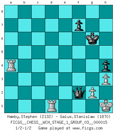 Last move : 1/2-1/2 2015 November 2 20:58:59 [Event "FICGS__CHESS__WCH_STAGE_1_GROUP_03__000015"] [Site "FICGS"] [Date "2015.07.02"] [Round "1"] [White "Hamby,Stephen"] [Black "Galus,Stanislaw"] [Result "1/2-1/2"] [WhiteElo "2132"] [BlackElo "1870"] 1.c4 Nf6 2.d4 e6 3.Nc3 Bb4 4.f3 d5 5.a3 Bxc3+ 6.bxc3 c5 7.cxd5 Nxd5 8.dxc5 Qa5 9.e4 Ne7 10.Be3 O-O 11.Qb3 Qc7 12.Bb5 Nec6 13.Ne2 Na5 14.Qb4 e5 15.Rd1 Na6 16.Bxa6 bxa6 17.Rd5 Rb8 18.Qa4 Rb1+ 19.Nc1 Bb7 20.c6 Nxc6 21.Rc5 Qb6 22.O-O Nd8 23.Re1 Ne6 24.Rc4 Qb2 25.Kf1 a5 26.Qxa5 Rd8 27.Rb4 Qxc3 28.Qxd8+ Nxd8 29.Rxb1 Qxa3 30.Kf2 Qe7 31.Kg1 h5 32.Nb3 Ne6 33.Na5 Ba6 34.Nc6 Qd6 35.Nb4 Nd4 36.Nxa6 Qxa6 37.Bxd4 exd4 38.Rbd1 Qd6 39.Re3 a5 40.Red3 Kh7 41.Kh1 a4 42.Rxd4 Qa3 43.R4d3 Qb2 44.R3d2 Qa3 45.Rb1 g5 46.R2d1 Qa2 47.Ra1 Qc2 48.Rdc1 Qb2 49.Rcb1 Qc2 50.Rf1 Kg6 51.Ra3 g4 52.Rfa1 gxf3 53.Rxf3 h4 54.h3 Qxe4 55.Rfa3 Qe2 56.Rxa4 Qf2 57.Rd1 1/2-1/2 English, 1...Nf6 (Anglo-Indian defense) Kingside Castling by player Black (move 10) Kingside Castling by player White (move 22) 10 pieces endgame at move 54 : White KRRPP , Black KQPPP WHITE : King + 2 Rooks 2 Pawns BLACK : King + 1 Queen 3 Pawns 9 pieces endgame at move 56 : White KRRPP , Black KQPP WHITE : King + 2 Rooks 2 Pawns BLACK : King + 1 Queen 2 Pawns This chess game ended in a draw. Follow this game move after move (download)My style is somewhere between that of Tal and Petrosian. (Reshevsky) Charakterschwächen offenbaren sich normalerweise während einer Schachpartie. (Garry Kasparov) Me siento como si fuera una pieza en una partida de Ajedrez, cuando mi oponente me indica: esa pieza no puede ser movida. (Soren Kierkegaard) Fischer est le meilleur joueur du monde et Karpov n'est qu'un joueur de bistrot. (Garry Kasparov, agé de 16 ans) Real knowledge is to know the extent of one's ignorance. (Confucius)