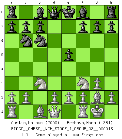 Last move : 1-0 2015 August 24 9:24:8 [Event "FICGS__CHESS__WCH_STAGE_1_GROUP_03__000015"] [Site "FICGS"] [Date "2015.07.02"] [Round "1"] [White "Austin,Nathan"] [Black "Pechova,Hana"] [Result "1-0"] [WhiteElo "2000"] [BlackElo "1251"] 1.c4 e5 2.Nc3 Nf6 3.g3 d5 4.cxd5 Nxd5 5.Nf3 Nc6 6.Bg2 Nb6 7.O-O 1-0 This chess game has been lost on time (started : 2015.07.02 14:13:26) English : Bremen, reverse Dragon Kingside Castling by player White (move 7) Player White won this chess game. Follow this game move after move (download)War is the child of passion, passion is the child of narcissism and narcissism is the child. (...) Another game ? (Thibault de Vassal) In Buenos Aires ist es nicht mein vorrangiges Ziel ein starkes Turnier zu organisieren, sondern ein Turnier für Gentlemen. Ich würde nie Kamsky einladen. Ich mag keine Probleme. (Miguel Najdorf) Cada Peón es potencialmente una Reina. (James Mason) Toutes les manuvres exécutées sur une colonne ouverte ont pour but ultime l'intrusion définitive sur la septième ou la huitième rangée, en plein cur de la position ennemie. (Aaron Nimzovitch) If you ain't just a little scared when you enter a casino, you are either very rich or you haven't studied the games enough. (Pappy)