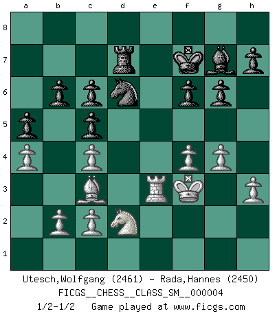 Last move : 1/2-1/2 2007 June 16 12:5:44 [Event "FICGS__CHESS__CLASS_SM__000004"] [Site "FICGS"] [Date "2007.03.06"] [Round "1"] [White "Utesch,Wolfgang"] [Black "Rada,Hannes"] [Result "1/2-1/2"] [WhiteElo "2461"] [BlackElo "2450"] 1.e4 c5 2.Nf3 Nc6 3.Bb5 g6 4.Bxc6 dxc6 5.d3 Bg7 6.h3 Nh6 7.O-O b6 8.a4 a5 9.Re1 O-O 10.Na3 Qc7 11.Bd2 f6 12.e5 Nf7 13.exf6 exf6 14.Nc4 Ba6 15.Qe2 Bxc4 16.dxc4 Rad8 17.Qe6 Qd6 18.Bc3 Rd7 19.Qe3 Rfd8 20.Re2 Bf8 21.Rd2 Qe7 22.Qxe7 Bxe7 23.Re1 Rxd2 24.Nxd2 Rd7 25.f4 Nd6 26.g4 Kf7 27.Kg2 Bf8 28.Kf3 Bg7 29.Re3 1/2-1/2 Comment by player 1 : Wolfgang Utesch : Hallo Hannes, akademische Vorteile sind m.E. im Fernschach praktisch nie auszunutzen, da der Remis-Korridor einfach zu breit ist, ohne Fehler ist da nichts zu machen. Beim ICCF habe ich in der Vergangenheit einige Male gespielt und habe dort in meinem letzten Turnier auch eine IM-Norm erreicht. Demnächst spiele ich wieder in der Champions League B mit den Chess Rubbers am 2. Brett. Mein aktuelles ICCF-Rating: 2444. Gruß, Wolfgang Sicilian : Nimzovich-Rossolimo attack (with ...g6, without ...d6) Kingside Castling by player White (move 7) Kingside Castling by player Black (move 9) This chess game ended in a draw. Follow this game move after move (download)Pawns are born free, yet they are everywhere in chains. (Rick Kennedy) Obwohl ich vom Stil her kaum zu den Priestern der Schachkunst gezählt werde, halte ich Schach doch für eine Kunst. (Tigran Petrosjan) Nunca nadie ha ganado una partida de Ajedrez rindiendose. (Unknown) La menace est plus forte que l'exécution. (Aaron Nimzovitch) There are two major products that came out of Berkeley: LSD and UNIX. We do not believe this is to be a coincidence. (Jeremy S. Anderson)