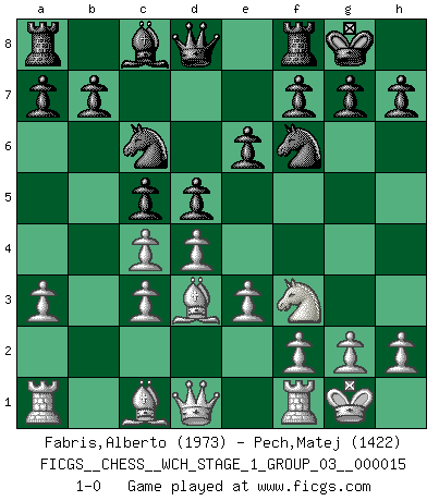 Last move : 1-0 2015 August 15 20:44:59 [Event "FICGS__CHESS__WCH_STAGE_1_GROUP_03__000015"] [Site "FICGS"] [Date "2015.07.02"] [Round "1"] [White "Fabris,Alberto"] [Black "Pech,Matej"] [Result "1-0"] [WhiteElo "1973"] [BlackElo "1422"] 1.d4 Nf6 2.c4 e6 3.Nc3 Bb4 4.e3 O-O 5.Bd3 d5 6.Nf3 c5 7.O-O Nc6 8.a3 Bxc3 9.bxc3 1-0 This chess game has been lost on time (started : 2015.07.02 14:13:26) Nimzo-Indian : 4.e3 O-O, 5.Bd3 d5 Kingside Castling by player Black (move 4) Kingside Castling by player White (move 7) Player White won this chess game. Follow this game move after move (download)Your body has to be in top condition. Your Chess deteriorates as your body does. You can't separate body from mind. (Bobby Fischer) In der Schule lernt man nichts. Es ist nur Zeitverschwendung. (Robert James Fischer) Algunos sacrificios son sólidos, los demás son míos. (Mikhail Tal) Les Cavaliers se révèlent fort utiles dans les positions fermées. D'habitude, les Fous sont un peu plus forts que les Cavaliers dans les positions ouvertes. Qu'on le veuille ou non, il restera toujours des exceptions ! Logic : The art of thinking and reasoning in strict accordance with the limitations and incapacities of the human misunderstanding. (Ambrose Bierce)