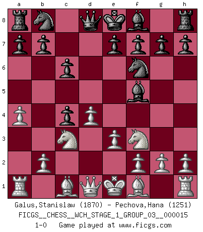 Last move : 1-0 2015 August 21 21:25:54 [Event "FICGS__CHESS__WCH_STAGE_1_GROUP_03__000015"] [Site "FICGS"] [Date "2015.07.02"] [Round "1"] [White "Galus,Stanislaw"] [Black "Pechova,Hana"] [Result "1-0"] [WhiteElo "1870"] [BlackElo "1251"] 1.d4 d5 2.c4 c6 3.Nf3 Nf6 4.Nc3 dxc4 5.a4 Bf5 6.e3 1-0 This chess game has been lost on time (started : 2015.07.02 14:13:26) QGD Slav : Dutch variation Player White won this chess game. Follow this game move after move (download)I thought the most common mistake [in chess] was the first one: Learning the game :P (Garvin Gray, FICGS forum) Nach Morphy wurde nichts neues mehr in der Behandlung offener Positionen gefunden. (Mikhail Moiseyevich Botvinik) Debes de llevar a tu oponente hacia un profundo y obscuro bosque donde 2+2=5, y el camino que conduce a la salida es suficientemente ancho para solamente uno. (Mikhail Tal) Nous sommes les pions de la mystérieuse partie d'Echecs jouée par Dieu. Il nous déplace, nous arrête, nous pousse encore, puis nous lance un à un dans la boîte du Néant. Epitaphe sur la tombe de David Janowsky (1868-1927). They misunderestimated me. (George W. Bush, Bentonville nov. 6, 2000)