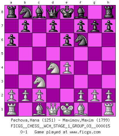 Last move : 0-1 2015 August 28 21:44:33 [Event "FICGS__CHESS__WCH_STAGE_1_GROUP_03__000015"] [Site "FICGS"] [Date "2015.07.02"] [Round "1"] [White "Pechova,Hana"] [Black "Maximov,Maxim"] [Result "0-1"] [WhiteElo "1251"] [BlackElo "1799"] 1.e4 c5 2.Nf3 e6 3.d4 cxd4 4.Nxd4 Nf6 5.Nc3 a6 0-1 This chess game has been lost on time (started : 2015.07.02 14:13:26) Sicilian : Anderssen variation Player Black won this chess game. Follow this game move after move (download)When the Chess game is over, the Pawn and the King go back to the same box. (Irish saying) Ivan Sokolov treibt mich als Beifahrer an mit go Loeky go - . (Loek van Wely) Los problemas de Ajedrez exigen del compositor las mismas virtudes que caracterizan todo el arte de valor: originalidad, invención, concisión, armonía, complejidad e insinceridad explendida. (Vladimir Nabokov) Soyez une menace à chaque fois que vous vous asseyez pour jouer. (Ken Smith) Chess is everything: art, science and sport. (Anatoly Karpov)