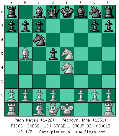 Last move : 1/2-1/2 2015 August 25 8:41:37 [Event "FICGS__CHESS__WCH_STAGE_1_GROUP_03__000015"] [Site "FICGS"] [Date "2015.07.02"] [Round "1"] [White "Pech,Matej"] [Black "Pechova,Hana"] [Result "1/2-1/2"] [WhiteElo "1422"] [BlackElo "1251"] 1.e4 e5 2.Nf3 Nc6 3.Bb5 f5 4.Nc3 fxe4 5.Nxe4 d5 6.Nxe5 1/2-1/2 Ruy Lopez : Schliemann defense, Berger variation This chess game ended in a draw. Follow this game move after move (download)You can only get good at Chess if you love the game. (Bobby Fischer) Als ich elf wurde, wurde ich einfach gut. (Robert James Fischer) El Ajedrez, como la música, como el amor, tiene el poder de hacer feliz a la gente. (Siegbert Tarrasch) Aux échecs, l'amour-propre est satisfait quand on remporte la victoire, mais il n'y a pas de honte à être battu. (Benjamin Franklin) You think that education is too expensive ? Try ignorance. (Derek Bok)