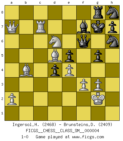 Last move : 1-0 2007 November 10 0:48:49 [Event "FICGS__CHESS__CLASS_SM__000004"] [Site "FICGS"] [Date "2007.03.06"] [Round "1"] [White "Ingersol,Harry"] [Black "Brunsteins,Daniel"] [Result "1-0"] [WhiteElo "2468"] [BlackElo "2409"] 1.d4 Nf6 2.c4 g6 3.Nc3 Bg7 4.e4 d6 5.Nf3 O-O 6.Be2 e5 7.Be3 Ng4 8.Bg5 f6 9.Bh4 Nc6 10.d5 Ne7 11.Nd2 Nh6 12.f3 c5 13.dxc6 bxc6 14.b4 Be6 15.Nb3 d5 16.O-O g5 17.cxd5 cxd5 18.Be1 d4 19.Na4 Ng6 20.Nac5 Bf7 21.g3 f5 22.Rc1 Bf6 23.Na5 f4 24.Qa4 Qd6 25.b5 Rfc8 26.Bb4 Bd8 27.Nab7 Qf6 28.Nxd8 Qxd8 29.Kg2 Kg7 30.Nb7 Qd7 31.Nd6 Rcb8 32.Qa3 Rb6 33.Rc6 Rxc6 34.bxc6 Qxc6 35.Rc1 Qd7 36.Qa5 Qd8 37.Rc7 Qf6 38.Bc4 Nh8 39.Bd5 Rg8 40.Qxa7 fxg3 41.hxg3 1-0 King's Indian : Gligoric-Taimanov system Kingside Castling by player Black (move 5) Kingside Castling by player White (move 16) Player White won this chess game. Follow this game move after move (download)The chessboard is the world, the pieces are the phenomena of the Universe, the rules of the game are what we call the laws of Nature and the player on the other side is hidden from us. (Thomas Huxley) Es ist schade, dass viele Schachsportler vergessen, wie wichtig Auftreten und angemessene Kleidung sind. (Alexandra Kosteniuk) Un mal día en el Ajedrez, es mejor que cualquier buen día en el trabajo. (Anonymous) A ce moment-là, je menaçais de comprendre la position ! (Clément L'Heureux) The only difference between a tax man and a taxidermist is that the taxidermist leaves the skin. (Mark Twain)