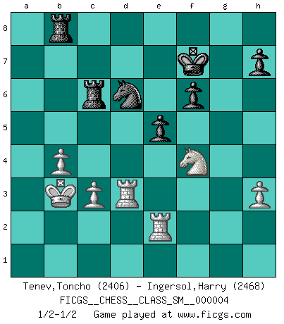Last move : 1/2-1/2 2007 July 10 5:28:41 [Event "FICGS__CHESS__CLASS_SM__000004"] [Site "FICGS"] [Date "2007.03.06"] [Round "1"] [White "Tenev,Toncho"] [Black "Ingersol,Harry"] [Result "1/2-1/2"] [WhiteElo "2406"] [BlackElo "2468"] 1.e4 c5 2.Nf3 d6 3.d4 cxd4 4.Nxd4 Nf6 5.Nc3 a6 6.Be3 e6 7.f3 b5 8.Qd2 b4 9.Na4 Nbd7 10.O-O-O Qa5 11.b3 Bb7 12.a3 Qc7 13.axb4 d5 14.e5 Nxe5 15.Kb1 Be7 16.Nc5 O-O 17.Bf4 Bd6 18.Bg3 Rfb8 19.Re1 Ned7 20.Nxd7 Qxd7 21.Bd3 Bc8 22.Be5 Bxe5 23.Rxe5 Qc7 24.f4 Bd7 25.Rc1 a5 26.b5 a4 27.h3 Qb6 28.b4 a3 29.c3 Qd6 30.g4 g6 31.Ka2 Be8 32.Re2 Bd7 33.Qe3 Ne8 34.Qe5 Qxe5 35.Rxe5 Nd6 36.f5 f6 37.Re3 e5 38.Nc6 Rb7 39.Ne7+ Kf7 40.Nxd5 gxf5 41.gxf5 Rc8 42.Kxa3 Bxb5 43.Bxb5 Rxb5 44.Rd3 Nxf5 45.Ka4 R5b8 46.Rf1 Ke6 47.Re1 Nd6 48.Nf4+ Ke7 49.Kb3 Rc6 50.Re2 Kf7 51.Nd5 Ke6 52.Nf4+ Kf7 53.Nd5 Ke6 54.Nf4+ Kf7 1/2-1/2 Sicilian : Najdorf, Byrne (English) attack Queenside Castling by player White (move 10) Kingside Castling by player Black (move 16) This chess game ended in a draw. Follow this game move after move (download)Bobby is the finest Chess player this country ever produced. His memory for the moves, his brilliance in dreaming up combinations, and his fierce determination to win are uncanny. (John Collins) Schach sollte überall auf der Welt Schulfach werden. Es fördert die geistige Auseinandersetzung. Es lehrt die Demut in der Niederlage. (Garry Kasparov) Con el fin de mejorar tu juego, debes de estudiar los finales antes que todo, ya que mientras que los finales pueden ser estudiados y dominados por sí mismos, el juegomedio y la apertura deben de ser estudiados en relación con los finales. (José Raúl Capablanca) Plusieurs personnes se sont demandées comment Tal faisait pour gagner... En fait, c'est très simple ! Il met ses pièces au centre de l'échiquier et les sacrifie quelque part ! (David Bronstein) All politicians must be presumed guilty until they are proven innocent. (Dinesh De Silva)