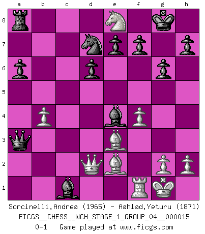 Last move : 0-1 2015 October 8 0:18:41 [Event "FICGS__CHESS__WCH_STAGE_1_GROUP_04__000015"] [Site "FICGS"] [Date "2015.07.02"] [Round "1"] [White "Sorcinelli,Andrea"] [Black "Aahlad,Yeturu"] [Result "0-1"] [WhiteElo "1965"] [BlackElo "1871"] 1.e4 c5 2.Nf3 d6 3.d4 cxd4 4.Nxd4 Nf6 5.Nc3 g6 6.Be3 Bg7 7.Be2 O-O 8.O-O Nc6 9.Nb3 a6 10.f4 Re8 11.Nd5 Nd7 12.Rb1 b5 13.c4 bxc4 14.Bxc4 Bb7 15.Be2 Na5 16.Nxa5 Qxa5 17.b4 Qxa2 18.Nc7 Bxe4 19.Rc1 Qa3 20.Qd2 Bb2 21.Nxe8 Bxc1 0-1 This chess game has been lost on time (started : 2015.07.02 14:13:29) Sicilian : Dragon, Classical attack Kingside Castling by player Black (move 7) Kingside Castling by player White (move 8) Player Black won this chess game. Follow this game move after move (download)A thorough understanding of the typical mating continuations makes the most complicated sacrificial combinations leading up to them not only not difficult, but almost a matter of course. (Siegbert Tarrasch) Ein Großmeister muß tausende Partien in seinem Kopf speichern, denn diese sind für Ihn, was die Worte der Muttersprache für gewöhnliche Leute sind, oder Noten für Musiker... (Garry Kasparov) Las combinaciones han sido siempre el aspecto más intrigante del Ajedrez. Los Maestros las buscan, el público las aplauden, los críticos las alaban. La razón se debe a que las combinaciones hacen posible que el Ajedrez sea más que un ejercicio matemático con una carencia de vida. Ellas son la poesía del juego, son del Ajedrez lo que la melodía es de la música. Ellas representan el triunfo de la mente sobre la materia. (Reuben Fine) Ce qui caractérise les parties de combat, c'est que si le défenseur a constamment de difficiles problèmes à résoudre, l'attaquant doit chercher sans relâche de nouvelles possibilités d'attaque. (Koblentz) The arrogant army will lose certainly the battle. (Chinese proverb)