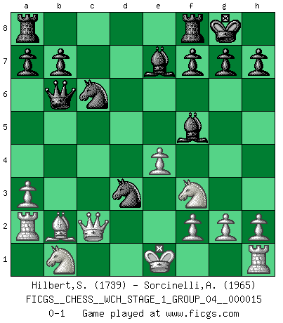 Last move : 0-1 2015 September 23 23:25:46 [Event "FICGS__CHESS__WCH_STAGE_1_GROUP_04__000015"] [Site "FICGS"] [Date "2015.07.02"] [Round "1"] [White "Hilbert,Stephan J."] [Black "Sorcinelli,Andrea"] [Result "0-1"] [WhiteElo "1739"] [BlackElo "1965"] 1.b4 e5 2.Bb2 Bxb4 3.Bxe5 Nf6 4.c4 O-O 5.a3 Be7 6.e3 d5 7.cxd5 Nxd5 8.Nf3 c5 9.Be2 Nc6 10.Bb2 Qb6 11.Qc2 Bf5 12.d3 c4 13.e4 cxd3 14.Bxd3 Nf4 15.Ra2 Nxd3+ 0-1 This chess game has been lost on time (started : 2015.07.02 14:13:29) Polish (Sokolsky) opening Kingside Castling by player Black (move 4) Player Black won this chess game. Follow this game move after move (download)Discovered check is the dive bomber of the Chessboard. (Reuben Fine) Wenn Spassky eine Figur opfert kannst du genauso gut aufgeben. Aber wenn Tal eine Figur opfert, spiel weiter. Er könnte noch eine weitere opfern, und dann ... wer weiß? (Miguel Najdorf) Todavía soy una víctima del Ajedrez. Tiene toda la belleza del arte y mucho mas. No puede ser comercializado. El Ajedrez es mas puro que el arte en su posición social. (Marcel Duchamp) Même un GMI sait rarement calculer sur plus de cinq coups une attaque à sacrifices. (Rudolf Spielmann) Are you threatening me, Master Jedi ? (Chancellor Palpatine in Star Wars ep.3)