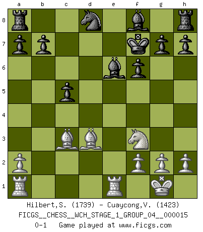 Last move : 0-1 2015 September 23 23:25:46 [Event "FICGS__CHESS__WCH_STAGE_1_GROUP_04__000015"] [Site "FICGS"] [Date "2015.07.02"] [Round "1"] [White "Hilbert,Stephan J."] [Black "Cuaycong,Virgilio"] [Result "0-1"] [WhiteElo "1739"] [BlackElo "1423"] 1.e4 e5 2.Nf3 Nc6 3.d4 exd4 4.c3 dxc3 5.Bc4 d6 6.O-O Nf6 7.e5 dxe5 8.Qxd8+ Nxd8 9.Nxe5 cxb2 10.Bxb2 Be6 11.Bd3 Nd5 12.Nc3 Nxc3 13.Bxc3 f6 14.Nf3 c5 15.Rfe1 Kf7 0-1 This chess game has been lost on time (started : 2015.07.02 14:13:29) Scotch : Goering gambit Kingside Castling by player White (move 6) Player Black won this chess game. Follow this game move after move (download)Bobby is the finest Chess player this country ever produced. His memory for the moves, his brilliance in dreaming up combinations, and his fierce determination to win are uncanny. (John Collins) Schach ist Kampf, hauptsächlich jedoch gegen die eigenen Fehler. (Savielly Grigorievitsch Tartakower) El Ajedrez es parte de la cultura, y si una cultura esta en decadencia, entonces también el Ajedrez declinará. (Mikhail Botvinnik) Les Echecs mettent en conflit, non pas deux intelligences, mais deux volontés. (Lasker) Memory is a way of holding onto the things you love, the things you are, the things you never want to lose. (from the television show: The Wonder Years)