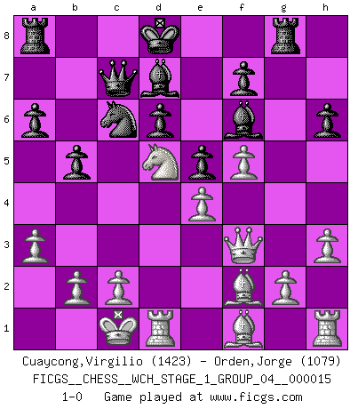 Last move : 1-0 2015 August 27 1:40:17 [Event "FICGS__CHESS__WCH_STAGE_1_GROUP_04__000015"] [Site "FICGS"] [Date "2015.08.01"] [Round "1"] [White "Cuaycong,Virgilio"] [Black "Orden,Jorge"] [Result "1-0"] [WhiteElo "1423"] [BlackElo "1079"] 1.e4 c5 2.Nf3 d6 3.d4 cxd4 4.Nxd4 Nf6 5.Nc3 a6 6.Bg5 e6 7.f4 h6 8.Bh4 Be7 9.Qf3 Qb6 10.O-O-O Nc6 11.Bf2 e5 12.Nf5 Qc7 13.Nxg7+ Kd8 14.h3 b5 15.a3 Rg8 16.Nh5 Be6 17.f5 Bd7 18.Nxf6 Bxf6 19.Nd5 1-0 Sicilian : Najdorf, 7.f4 Queenside Castling by player White (move 10) Player White won this chess game. Follow this game move after move (download)Chess is played with the mind and not with the hands ! (Renaud and Kahn) Das Schachspiel ist ein See, in welchem eine Mücke baden und ein Elefant ertrinken kann. (Emanuel Lasker) El juego del Ajedrez no es solamente una diversión quieta; algunas cualidades muy valuables de la mente se pueden adquirir y cultivar con el, como convertirlos en habitos disponibles para toda ocasión; ya que la vida es algo así como el Ajedrez. (Benjamin Franklin) Le plus grand jeu de l'esprit jamais inventé, plus vous l'apprenez, plus vous y prenez du plaisir. (Garry Kasparov) The real voyage of discovery consists not in seeking new lands but in seeing with new eyes. (Marcel Proust)