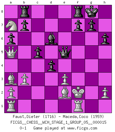 Last move : 0-1 2015 August 28 13:37:37 [Event "FICGS__CHESS__WCH_STAGE_1_GROUP_05__000015"] [Site "FICGS"] [Date "2015.07.02"] [Round "1"] [White "Faust,Dieter"] [Black "Maceda,Coco"] [Result "0-1"] [WhiteElo "1716"] [BlackElo "1959"] 1.f4 d5 2.Nf3 Nf6 3.e3 Bf5 4.Be2 e6 5.O-O h6 6.Nd4 Bh7 7.c4 c5 8.Nf3 Nc6 9.cxd5 exd5 10.Qb3 Rb8 11.Nc3 Be7 12.Ne5 O-O 13.Qa4 Qc7 14.b3 Nxe5 15.Nb5 Qc8 16.fxe5 Ne4 17.d3 a6 18.Na7 Qe6 19.dxe4 Bxe4 20.Qa5 Qxe5 21.Ba3 Bxg2 22.Kxg2 Bd6 23.Kf2 d4 0-1 Bird's Opening Kingside Castling by player White (move 5) Kingside Castling by player Black (move 12) Player Black won this chess game. Follow this game move after move (download)Why must I lose to this idiot ? (Aron Nimzovich) Es gibt zwei Arten von Opfern: Korrekte und meine. (Mikhail Nekhemyevich Tal) Es el objetivo de la escuela moderna no tratar cada posición de acuerdo a una regla general, sino de acuerdo al principio inherente en la posición. (Richard Reti) Il n'y a plus de joueurs du niveau de Jacob Murray dont la seule quête est le beau jeu, le plaisir de voir les pièces construire quelque chose. Sur 10 idées à la minute, 9 seront sans intérêt, la dernière s'avèrera géniale. (Christian Bauer) Man is reluctant to give credit for intelligence to anyone, except his enemies. (Albert Einstein)