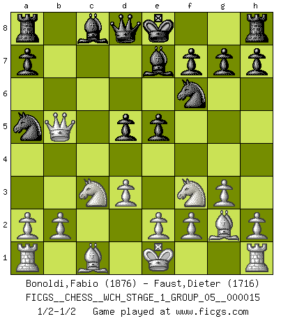 Last move : 1/2-1/2 2015 July 24 14:6:34 [Event "FICGS__CHESS__WCH_STAGE_1_GROUP_05__000015"] [Site "FICGS"] [Date "2015.07.02"] [Round "1"] [White "Bonoldi,Fabio"] [Black "Faust,Dieter"] [Result "1/2-1/2"] [WhiteElo "1876"] [BlackElo "1716"] 1.c4 Nf6 2.g3 e5 3.Bg2 c6 4.Nc3 d5 5.cxd5 cxd5 6.d3 Be7 7.Qb3 Be6 8.Nf3 Nc6 9.Qxb7 Na5 10.Qa6 Bc8 11.Qb5+ 1/2-1/2 English, 1...Nf6 (Anglo-Indian defense) This chess game ended in a draw. Follow this game move after move (download)When I asked Fischer why he had not played a certain move in our game, he replied: 'Well, you laughed when I wrote it down !' (Mikhail Tal) Wer sich die Fähigkeit anerziehen will im Schach selbstständig zu denken, der muß alles meiden, was leblos ist: ausgeklügelte Theorien, die sich auf sehr wenige Beispiele und eine Menge Hirngespinste stützen. (Emanuel Lasker) Los asuntos humanos son como una partida de Ajedrez: solo aquellos que no lo toman seriamente, pueden ser llamados buenos jugadores. (Hung Tzu Ch'eng) La menace est plus forte que l'exécution. (Aaron Nimzovitch) The real danger is not that computers will begin to think like men, but that men will begin to think like computers. (Sydney J. Harris)
