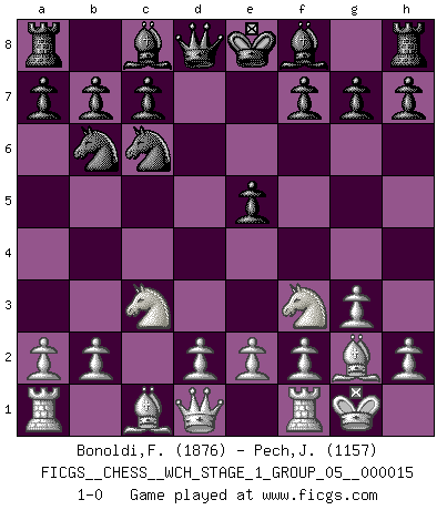 Last move : 1-0 2015 August 18 9:7:41 [Event "FICGS__CHESS__WCH_STAGE_1_GROUP_05__000015"] [Site "FICGS"] [Date "2015.07.02"] [Round "1"] [White "Bonoldi,Fabio"] [Black "Pech,Jaroslav senior"] [Result "1-0"] [WhiteElo "1876"] [BlackElo "1157"] 1.c4 e5 2.g3 Nf6 3.Bg2 d5 4.cxd5 Nxd5 5.Nc3 Nb6 6.Nf3 Nc6 7.O-O 1-0 This chess game has been lost on time (started : 2015.07.02 14:13:32) English Opening Kingside Castling by player White (move 7) Player White won this chess game. Follow this game move after move (download)There are two classes of men; those who are content to yield to circumstances and who play whist; those who aim to control circumstances, and who play Chess. (Mortimer Collins) Oft bringt ein stiller Zug das Erdbeben. (Richard Reti) Dios mío, Bobby Fischer juega tan simple. (Alexei Suetin) Plusieurs personnes se sont demandées comment Tal faisait pour gagner... En fait, c'est très simple ! Il met ses pièces au centre de l'échiquier et les sacrifie quelque part ! (David Bronstein) The existence of forgetting has never been proved: We only know that some things don't come to mind when we want them. (Friedrich Nietzsche)