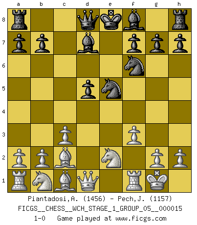 Last move : 1-0 2015 August 18 21:16:43 [Event "FICGS__CHESS__WCH_STAGE_1_GROUP_05__000015"] [Site "FICGS"] [Date "2015.07.02"] [Round "1"] [White "Piantadosi,Angelo"] [Black "Pech,Jaroslav senior"] [Result "1-0"] [WhiteElo "1456"] [BlackElo "1157"] 1.e4 c6 2.d4 d5 3.exd5 cxd5 4.Bd3 Nc6 5.c3 Nf6 6.Ne2 Bg4 7.f3 Bd7 8.O-O e5 9.dxe5 Nxe5 10.Bc2 1-0 This chess game has been lost on time (started : 2015.07.02 14:13:32) Caro-Kann : Exchange variation Kingside Castling by player White (move 8) Player White won this chess game. Follow this game move after move (download)My style is somewhere between that of Tal and Petrosian. (Reshevsky) Alle Schachspieler sollten auch ein Hobby haben. (Savielly Grigorievitsch Tartakower) Solo el jugador con la iniciativa tiene el derecho a atacar. (Wilhelm Steinitz) Nous vivons dans un monde échiquéen : chaque jour qui passe est un défi à relever. (Philosophe Sasha) I'm extremely disappointed. I send you out for exciting, new designer drugs, you come back with tomato sauce. (Gregory House, House M.D.)