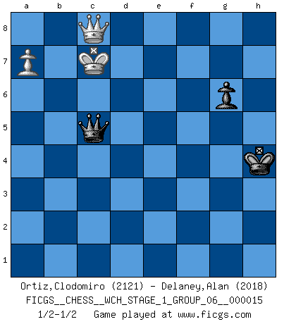 Last move : 1/2-1/2 2016 July 6 0:8:33 [Event "FICGS__CHESS__WCH_STAGE_1_GROUP_06__000015"] [Site "FICGS"] [Date "2015.07.02"] [Round "1"] [White "Ortiz,Clodomiro"] [Black "Delaney,Alan"] [Result "1/2-1/2"] [WhiteElo "2121"] [BlackElo "2018"] 1.d4 Nf6 2.c4 e6 3.Nc3 d5 4.Nf3 c6 5.e3 Nbd7 6.Qc2 Bd6 7.cxd5 exd5 8.Bd3 O-O 9.O-O Re8 10.Re1 c5 11.Bd2 c4 12.Bf1 Nb6 13.a4 a5 14.b3 Bg4 15.Reb1 Bxf3 16.gxf3 Rc8 17.Ne2 cxb3 18.Qxb3 Nc4 19.Be1 Re7 20.Ng3 Rec7 21.Bh3 Rb8 22.Bg2 b6 23.Qd3 g6 24.Ne2 Bf8 25.Rb5 Nd6 26.Rb3 Nc4 27.e4 Bh6 28.Nc3 Rbc8 29.Bh3 Rb8 30.Rd1 Bf4 31.R3b1 Bh6 32.Kh1 Bf4 33.Bg2 Rbc8 34.Rb5 Nd6 35.Rb3 Nc4 36.Bh3 Ra8 37.Qf1 Bh6 38.Qg2 Rb8 39.Bg4 dxe4 40.fxe4 Nxg4 41.Qxg4 Rd7 42.Nb5 Rc8 43.Rc3 Bf8 44.Rdc1 Nd6 45.Rxc8 Nxc8 46.d5 Nd6 47.Nd4 Qe8 48.f3 Nb7 49.Bh4 Nc5 50.Rc4 Nd3 51.Qg2 Bc5 52.Qc2 Nb4 53.Qc3 f5 54.Ne6 fxe4 55.Nxc5 bxc5 56.Rxc5 Nxd5 57.Qc4 Qf7 58.Qxe4 h6 59.Rxa5 Nc3 60.Qc6 Ne2 61.Bg3 Kh7 62.Rc5 Re7 63.Rc4 Nxg3+ 64.hxg3 Qf5 65.Kg2 Re2+ 66.Kg1 Qb1+ 67.Rc1 Re1+ 68.Rxe1 Qxe1+ 69.Kh2 Qe2+ 70.Kh3 h5 71.f4 Qg4+ 72.Kh2 h4 73.Qc7+ Kh6 74.Qc3 hxg3+ 75.Qxg3 Qd1 76.Qc3 Kh7 77.a5 Kg8 78.Qc4+ Kh7 79.a6 Qe1 80.Kg2 Qd2+ 81.Kf3 Qd1+ 82.Ke4 Qd7 83.Ke3 Qh3+ 84.Kd2 Qd7+ 85.Qd3 Qe6 86.Qb5 Qa2+ 87.Kc3 Qa1+ 88.Kc2 Qa2+ 89.Kd3 Qa3+ 90.Ke2 Qe7+ 91.Kf3 Qa3+ 92.Ke4 Qe7+ 93.Kd3 Qa3+ 94.Kd2 Qa2+ 95.Ke1 Qe6+ 96.Kf2 Qa2+ 97.Qe2 Qf7 98.Kg3 Qa7 99.Kg2 Qa8+ 100.Kf2 Qa7+ 101.Kf3 Qa8+ 102.Kg4 Qa7 103.Qh2+ Kg8 104.Qa2+ Kh7 105.Kf3 Qa8+ 106.Kf2 Qa7+ 107.Ke2 Qe7+ 108.Kf3 Qd7 109.Qh2+ Kg8 110.Qe2 Kh7 111.Qc4 Qh3+ 112.Ke2 Qg2+ 113.Ke3 Qh3+ 114.Kd4 Qd7+ 115.Kc3 Qd6 116.Qf7+ Kh8 117.Qb7 Qxf4 118.Qc8+ Kg7 119.Qd7+ Kg8 120.Qd4 Qc1+ 121.Kb4 Qh1 122.Kc5 Qh2 123.Qd8+ Kg7 124.a7 Qc2+ 125.Kb6 Qb2+ 126.Kc7 Qc2+ 127.Kb8 Qb1+ 128.Kc8 Qe4 129.Qd7+ Kh8 130.Qh3+ Kg7 131.Qc3+ Kh6 132.Qh8+ Kg5 133.Qd8+ Kg4 134.Qd7+ Kh4 135.Kb8 Qf4+ 136.Qc7 Qf8+ 137.Qc8 Qb4+ 138.Kc7 Qc5+ 139.Kb7 Qb5+ 140.Kc7 Qc5+ 141.Kb7 Qb5+ 142.Kc7 Qc5+ 1/2-1/2 Queen's pawn game Kingside Castling by player Black (move 8) Kingside Castling by player White (move 9) 10 pieces endgame at move 68 : White KQRPPP , Black KQPP WHITE : King + 1 Queen 1 Rook 3 Pawns BLACK : King + 1 Queen 2 Pawns 9 pieces endgame at move 68 : White KQPPP , Black KQPP WHITE : King + 1 Queen 3 Pawns BLACK : King + 1 Queen 2 Pawns 8 pieces endgame at move 74 : White KQPP , Black KQPP WHITE : King + 1 Queen 2 Pawns BLACK : King + 1 Queen 2 Pawns 7 pieces endgame at move 75 : White KQPP , Black KQP WHITE : King + 1 Queen 2 Pawns BLACK : King + 1 Queen 1 Pawn 6 pieces endgame at move 117 : White KQP , Black KQP WHITE : King + 1 Queen 1 Pawn BLACK : King + 1 Queen 1 Pawn This chess game ended in a draw. Follow this game move after move (download)Chess is a matter of delicate judgment, knowing when to punch and how to duck. (Bobby Fischer) Ich erzeugte keinen Neid, da mich die Schachspieler als Musiker und die Musiker als Schachspieler betrachteten. (Mark Taimanov) Bendita sea la memoria de aquel que dio al mundo este juego inmortal. (A. G. Gardiner) Les échecs sont utiles à l'exercice de la faculté de penser et à celle de l'imagination. Car nous devons posséder une méthode élaborée pour atteindre des buts partout où nous devons conduire notre raison. (Leibnitz) Big Chess is a place for big hallucinations. (Thibault de Vassal)