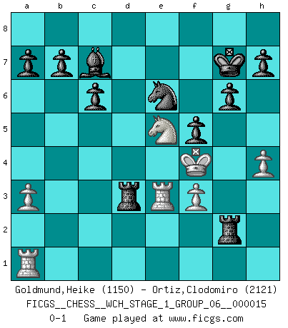 Last move : 0-1 2015 August 4 20:55:3 [Event "FICGS__CHESS__WCH_STAGE_1_GROUP_06__000015"] [Site "FICGS"] [Date "2015.07.02"] [Round "1"] [White "Goldmund,Heike"] [Black "Ortiz,Clodomiro"] [Result "0-1"] [WhiteElo "1150"] [BlackElo "2121"] 1.b4 e5 2.Bb2 Bxb4 3.Bxe5 Nf6 4.a3 Ba5 5.c4 Nc6 6.Bb2 d5 7.cxd5 Qxd5 8.Nc3 O-O 9.Nxd5 Nxd5 10.e4 Nf4 11.Nf3 Bg4 12.h3 Bh5 13.g4 Bg6 14.Nh4 Bxe4 15.f3 Bd5 16.Qa4 Ne6 17.Qb5 Rad8 18.Bc4 Bxc4 19.Qxc4 Rxd2 20.Bc3 Rc2 21.Qd3 Rxc3 22.O-O Rxd3 23.Nf5 Rfd8 24.Kg2 g6 25.Nh6+ Kg7 26.g5 Rd2+ 27.Kg3 Nxg5 28.Ng4 R8d3 29.h4 Ne4+ 30.Kf4 Nd8 31.Kxe4 f5+ 32.Kf4 c6 33.Ne5 Bc7 34.Rfe1 Rg2 35.Re3 Ne6+ 0-1 Polish (Sokolsky) opening Kingside Castling by player Black (move 8) Kingside Castling by player White (move 22) Player Black won this chess game. Follow this game move after move (download)In a gambit you give up a Pawn for the sake of getting a lost game. (Samuel Standige Boden) Wenn Dein Gegner dir ein Remis anbietet, versuch herauszufinden, weshalb er glaubt schlechter zu stehen. (Nigel Short) El Ajedrez es tan inspirador que yo no creo que un buen jugador sea capaz de tener un pensamiento malo durante una partida. (Wilhelm Steinitz) Ce qui est bien, c'est d'avoir tout un tas de pièces en prise : l'adversaire ne peut en prendre qu'une à la fois. Cité par Thierry Audin. Methinks King Thibault should dub Marius Zubac a knight of the square board... I mean table, henceforth addressing him as Sir Marius, and bestow on him a suitable land from the kingdom of FICGS & marry him off to a worthy, fair maiden, lest he slice our heads with his mighty sword in his wrath. (Dinesh De Silva)