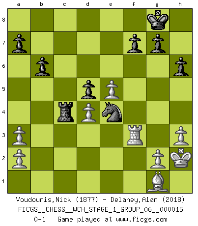 Last move : 0-1 2015 October 1 10:41:30 [Event "FICGS__CHESS__WCH_STAGE_1_GROUP_06__000015"] [Site "FICGS"] [Date "2015.07.02"] [Round "1"] [White "Voudouris,Nick"] [Black "Delaney,Alan"] [Result "0-1"] [WhiteElo "1877"] [BlackElo "2018"] 1.d4 Nf6 2.f4 d5 3.e3 c5 4.c3 Nc6 5.Bd3 Bg4 6.Nf3 e6 7.O-O Bd6 8.Qe1 O-O 9.Ne5 Bf5 10.Be2 Rc8 11.Na3 cxd4 12.exd4 Bxa3 13.bxa3 Nxe5 14.fxe5 Ne4 15.Bd3 Nxc3 16.Bxf5 exf5 17.Rxf5 Qd7 18.Rf3 Ne4 19.Qd1 Rc4 20.Be3 Rfc8 21.Rc1 h6 22.Rxc4 Rxc4 23.h3 b6 24.Qe2 Qc8 25.Kh2 Rc2 26.Qb5 Qc6 27.Qxc6 Rxc6 28.Bg1 Rc4 0-1 Canard Opening Kingside Castling by player White (move 7) Kingside Castling by player Black (move 8) Player Black won this chess game. Follow this game move after move (download)A man without frontiers. He didn't divide the East and the West, he brought them together in their admiration for him. (Ljubomir Ljubojevic, about Bobby Fischer's death) Ich bin es gewohnt, das die Jugend mir überhaupt keinen Respekt entgegenbringt. (Alexander Morozewich) Las piezas de Ajedrez son los bloques del alfabeto que moldean los pensamientos; y esos pensamientos, aunque hagan un diseño visual en el tablero, expresan abstractamente su belleza como un poema. (Marcel Duchamp) Les échecs, c'est l'art d'analyser. (Mikhail Botvinnik) Life is like a play: it's not the length but the excellence of the acting that matters. (Seneca)