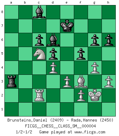 Last move : 1/2-1/2 2007 November 27 20:54:51 [Event "FICGS__CHESS__CLASS_SM__000004"] [Site "FICGS"] [Date "2007.03.06"] [Round "1"] [White "Brunsteins,Daniel"] [Black "Rada,Hannes"] [Result "1/2-1/2"] [WhiteElo "2409"] [BlackElo "2450"] 1.d4 Nf6 2.Nf3 g6 3.c4 Bg7 4.Nc3 d5 5.Bg5 Ne4 6.cxd5 Nxg5 7.Nxg5 e6 8.Nf3 exd5 9.e3 O-O 10.b4 Qd6 11.Qb3 Bf5 12.Be2 c6 13.O-O Nd7 14.Rac1 a6 15.Na4 b5 16.Nc5 Nxc5 17.Rxc5 a5 18.Rfc1 Bd7 19.a4 bxa4 20.Qxa4 axb4 21.Qxb4 Ra2 22.Qe1 Rfa8 23.R5c2 Rxc2 24.Rxc2 Qa3 25.h3 f6 26.Qd1 Bf8 27.Rc1 Bd6 28.Ne1 Qa4 29.Nd3 Qxd1+ 30.Bxd1 Ra3 31.Be2 Kf7 32.g4 Ke7 33.Kg2 h6 34.Nc5 Bc8 35.Rc2 f5 36.Bd1 Kd8 37.Bf3 Ke7 1/2-1/2 King's Indian : East Indian defense Kingside Castling by player Black (move 9) Kingside Castling by player White (move 13) This chess game ended in a draw. Follow this game move after move (download)Chess is a forcing house where the fruits of character can ripen more fully than in life. (Edward Morgan Foster) Wenn Du absolut nicht mehr weißt, was Du tun sollst, dann ist es Zeit für Panik. (John van der Wiel) Aquel que teme a un Peón de Reina aislado, debería de retirarse del Ajedrez. (Siegbert Tarrasch) Les réformistes prétendent que les progrès de la théorie conduiront à la disparition des échecs, et qu'il faut, pour leur rendre vie, en remanier les règles. En réalité, qu'exprime cette affirmation? Le mépris de l'intuition, de l'imagination et de tous les autres éléments qui font des échecs un art. (Alexander Alekhine) The only thing that overcomes hard luck is hard work. (Harry Golden)