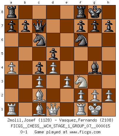 Last move : 0-1 2015 August 17 9:1:34 [Event "FICGS__CHESS__WCH_STAGE_1_GROUP_07__000015"] [Site "FICGS"] [Date "2015.07.02"] [Round "1"] [White "Zmolil,Josef"] [Black "Vasquez,Fernando"] [Result "0-1"] [WhiteElo "1128"] [BlackElo "2108"] 1.d4 Nf6 2.c4 e6 3.Nc3 Bb4 4.e3 O-O 5.Bd3 d5 6.Nf3 c5 7.O-O Nc6 8.a3 Bxc3 9.bxc3 Qc7 10.cxd5 exd5 11.a4 c4 12.Bc2 Bg4 0-1 This chess game has been lost on time (started : 2015.07.02 14:13:39) Nimzo-Indian : 4.e3 O-O, 5.Bd3 d5 Kingside Castling by player Black (move 4) Kingside Castling by player White (move 7) Player Black won this chess game. Follow this game move after move (download)Chess books should be used as we use glasses: to assist the sight, although some players make use of them as if they thought they conferred sight. (Jose Raul Capablanca) Alles was am Schachbrett zählt sind gute Züge. (Robert James Fischer) Un juego de Ajedrez es un dialogo, una conversación entre un jugador y su oponente. Cada movimiento del oponente puede contener amenazas o tropiezos, pero un jugador no se puede defender de las amenazas o tomar ventaja de los tropiezos si es que no se pregunta a sí mismo: ¿Que es lo que mi oponente va a hacer después de cada movida?. (Bruce A. Moon) Les Echecs sont et restent toujours un combat, un combat intégral comme la boxe, la lutte ou un autre sport, et où il doit y avoir un vainqueur et un vaincu. (Joseph Emil Diemer) Think like a man of action, act like a man of thought. (Henri Louis Bergson)