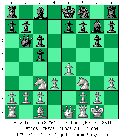 Last move : 1/2-1/2 2007 March 21 17:35:29 [Event "FICGS__CHESS__CLASS_SM__000004"] [Site "FICGS"] [Date "2007.03.06"] [Round "1"] [White "Tenev,Toncho"] [Black "Shwimmer,Peter"] [Result "1/2-1/2"] [WhiteElo "2406"] [BlackElo "2541"] 1.e4 c5 2.Nf3 Nc6 3.Bb5 g6 4.Bxc6 dxc6 5.d3 Bg7 6.h3 Nf6 7.Nc3 Qb6 8.O-O Nd7 9.Qe1 Nf8 10.Na4 Qb5 11.Nc3 Qb6 12.Na4 Qb5 13.Nc3 Qb6 1/2-1/2 Sicilian : Nimzovich-Rossolimo attack (with ...g6, without ...d6) Kingside Castling by player White (move 8) This chess game ended in a draw. Follow this game move after move (download)Modern Chess is too much concerned with things like Pawn structure. Forget it, Checkmate ends the game. (Nigel Short) Stil? Ich habe keinen Stil! (Anatoly Karpov) El Ajedrez, como cualquier actividad creativa, solo puede existir a través del esfuerzo combinado de aquellos que tienen talento creativo y de aquellos que poseen la habilidad de organizar su trabajo creativo. (Mikhail Botvinnik) Dieu déplace le joueur, et celui-ci la pièce. Quel Dieu derrière Dieu commence donc la trame ? Arturo Perez-Reverte (prix de littérature policière 1993). All battles are fought by scared men who'd rather be someplace else. (John Wayne in the movie In harm's way)