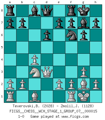 Last move : 1-0 2015 August 24 9:24:8 [Event "FICGS__CHESS__WCH_STAGE_1_GROUP_07__000015"] [Site "FICGS"] [Date "2015.07.02"] [Round "1"] [White "Teverovski,Bogoljub"] [Black "Zmolil,Josef"] [Result "1-0"] [WhiteElo "2028"] [BlackElo "1128"] 1.Nf3 Nf6 2.c4 c5 3.Nc3 Nc6 4.g3 g6 5.Bg2 Bg7 6.d4 cxd4 7.Nxd4 O-O 8.O-O Nxd4 9.Qxd4 d6 10.Qd3 1-0 This chess game has been lost on time (started : 2015.07.02 14:13:39) Reti Opening Kingside Castling by player Black (move 7) Kingside Castling by player White (move 8) Player White won this chess game. Follow this game move after move (download)Chess opens and enriches your mind. (Saudin Robovic) Wenn es im Universum noch irgendwo intelligente Lebewesen gibt, dann kennen sie Go. (Emanuel Lasker) Jugadores de primera clase pierden en contra de jugadores de segunda clase porque los jugadores de segunda clase a veces juegan una partida de primer clase. (Siegbert Tarrasch) Mais l'homme est une créature légère et illogique : semblable au joueur d'échecs, il n'aime que le processus du but à atteindre, non le but lui-même. (Dostoïevsky) A specialist learns more and more about less and less until he knows everything about nothing. (Nicholas Murray Butler)