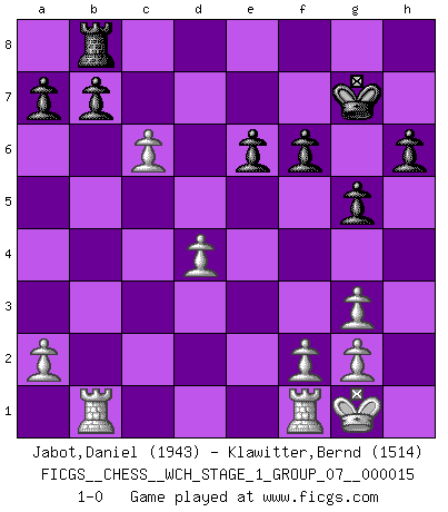 Last move : 1-0 2015 August 9 12:21:43 [Event "FICGS__CHESS__WCH_STAGE_1_GROUP_07__000015"] [Site "FICGS"] [Date "2015.07.02"] [Round "1"] [White "Jabot,Daniel"] [Black "Klawitter,Bernd"] [Result "1-0"] [WhiteElo "1943"] [BlackElo "1514"] 1.e4 c6 2.d4 d5 3.exd5 cxd5 4.c4 e6 5.Nc3 Nf6 6.Nf3 Bb4 7.cxd5 Qxd5 8.Bd3 Bxc3+ 9.bxc3 O-O 10.c4 Qd8 11.O-O h6 12.Ne5 Nbd7 13.Ba3 Qc7 14.Bxf8 Nxf8 15.Qf3 Rb8 16.Qg3 Bd7 17.Nxd7 Qxg3 18.Nxf6+ gxf6 19.hxg3 Kg7 20.Rab1 Ng6 21.Bxg6 fxg6 22.c5 g5 23.c6 1-0 Caro-Kann : Panov-Botvinnik attack Kingside Castling by player Black (move 9) Kingside Castling by player White (move 11) Player White won this chess game. Follow this game move after move (download)After black's reply to 1.e4 with 1..e5, leaves him always trying to get into the game. (Howard Staunton) Obwohl ich vom Stil her kaum zu den Priestern der Schachkunst gezählt werde, halte ich Schach doch für eine Kunst. (Tigran Petrosjan) El poder defensivo de una pieza clavada, solamente es imaginario. (Aaron Nimzovich) J'ai vu le vaincu d'Echecs jouer des années durant dans l'espoir de la fête de la victoire. Car tu es plus riche de ce qu'elle existe si même elle n'est point pour toi. Ainsi de la perle du fond des mers. (Antoine de Saint-Exupéry) Macintosh - we might not get everything right, but at least we knew the century was going to end. (Douglas Adams)