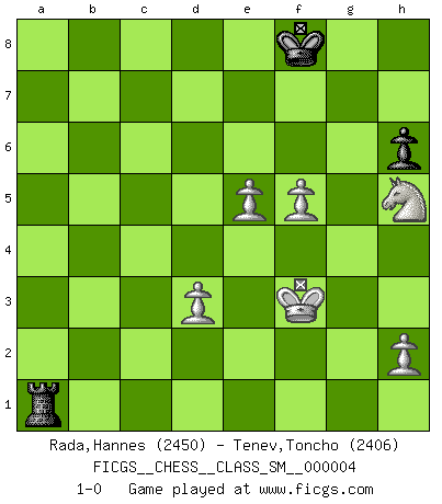Last move : 1-0 2007 June 17 8:54:22 [Event "FICGS__CHESS__CLASS_SM__000004"] [Site "FICGS"] [Date "2007.03.06"] [Round "1"] [White "Rada,Hannes"] [Black "Tenev,Toncho"] [Result "1-0"] [WhiteElo "2450"] [BlackElo "2406"] 1.c4 e5 2.g3 Nf6 3.Bg2 d5 4.cxd5 Nxd5 5.Nc3 Nb6 6.Nf3 Nc6 7.O-O Be7 8.a3 O-O 9.b4 Be6 10.d3 a5 11.b5 Nd4 12.Nxe5 Bf6 13.f4 Nb3 14.Be3 Nxa1 15.Qxa1 Nd5 16.Bd4 a4 17.Ne4 Bxe5 18.Bxe5 f6 19.Bd4 b6 20.f5 Bf7 21.g4 Ra5 22.g5 Be8 23.gxf6 Nxf6 24.Ng5 Qe7 25.Qa2+ Kh8 26.Ne6 Rg8 27.Qc4 Bd7 28.Bc6 Bxc6 29.Qxc6 Qxa3 30.Qxc7 Qb4 31.Kh1 R5a8 32.Rg1 a3 33.Qxb6 Rab8 34.Qc6 Qxb5 35.Qxb5 Rxb5 36.Nxg7 a2 37.Bxf6 h6 38.Nh5 Kh7 39.Bg7 Rxg7 40.Rxg7+ Kh8 41.Ra7 Rb1+ 42.Kg2 a1Q 43.Rxa1 Rxa1 44.e4 Kg8 45.e5 Kf8 46.Kf3 1-0 English Opening Kingside Castling by player White (move 7) Kingside Castling by player Black (move 8) Promotion Queen by player Black (move 42) 10 pieces endgame at move 43 : White KRNPPPP , Black KRP WHITE : King + 1 Rook 1 Knight 4 Pawns BLACK : King + 1 Rook 1 Pawn 9 pieces endgame at move 43 : White KNPPPP , Black KRP WHITE : King + 1 Knight 4 Pawns BLACK : King + 1 Rook 1 Pawn Player White won this chess game. Follow this game move after move (download)Bobby Fischer is the greatest Chess player who has ever lived. (Ken Smith) Ich habe Putins Aufstieg an die Macht beobachtet und seine Politik, die demokratischen Institutionen meines Landes zu zerstören. (Garry Kasparov) El Ajedrez es un juego de pelea el cual es puramente intelectual e incluye la suerte. (Richard Reti) Ne tendez aucun piège pour le plaisir ! Ne jouez rien dans l'espoir que l'adversaire réagisse de façon stupide ! Prenez toujours pour acquis que l'adversaire va trouver le meilleur coup ! Ne jouez jamais de coup dans l'espoir que l'adversaire ne voie pas la menace ! Chacun de vos coups doit améliorer la position d'une façon ou d'une autre. The beginning of wisdom is silence. The second step is listening. (Unknown)