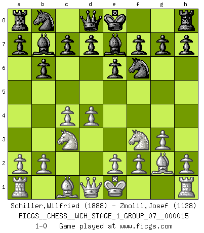 Last move : 1-0 2015 August 21 9:23:40 [Event "FICGS__CHESS__WCH_STAGE_1_GROUP_07__000015"] [Site "FICGS"] [Date "2015.07.02"] [Round "1"] [White "Schiller,Wilfried"] [Black "Zmolil,Josef"] [Result "1-0"] [WhiteElo "1888"] [BlackElo "1128"] 1.d4 Nf6 2.c4 e6 3.Nf3 b6 4.g3 Bb7 5.Bg2 Be7 6.Nc3 1-0 This chess game has been lost on time (started : 2015.07.02 14:13:39) Queen's Indian : Anti-Queen's Indian system Player White won this chess game. Follow this game move after move (download)The isolated Pawn casts gloom over the entire chessboard. (Aaron Nimzovich) Das Blackmar-Diemer-Gambit verändert den ganzen Menschen! (Emil Joseph Diemer) El Ajedrez es un juego terrible. Si no dominas el centro, tu oponente tiene una posición mas libre. Si tu tienes el centro, entonces realmente tienes algo de que preocuparte. (Siegbert Tarrasch) Demandez au pauvre Cg1 ce qu'il en pense. Eduard Gufeld à propos de la variante Saemisch de l'Est-Indienne. I believe in luck. How else can you explain the success of those you dislike ? (Jean Cocteau)