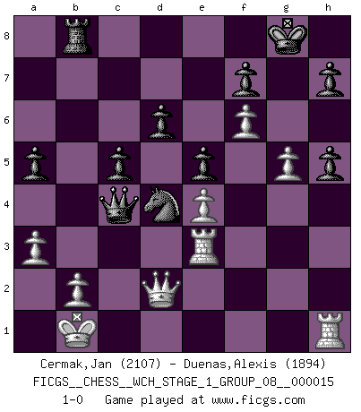 Last move : 1-0 2015 August 4 17:0:12 [Event "FICGS__CHESS__WCH_STAGE_1_GROUP_08__000015"] [Site "FICGS"] [Date "2015.07.02"] [Round "1"] [White "Cermak,Jan"] [Black "Duenas,Alexis"] [Result "1-0"] [WhiteElo "2107"] [BlackElo "1894"] 1.d4 Nf6 2.c4 e6 3.Nf3 Bb4+ 4.Bd2 Bxd2+ 5.Qxd2 O-O 6.g3 b6 7.Bg2 Bb7 8.Nc3 Ne4 9.Qd3 Nxc3 10.Ng5 Ne4 11.Bxe4 Bxe4 12.Qxe4 Qxg5 13.Qxa8 Nc6 14.Qb7 Nxd4 15.Rd1 c5 16.e3 Nc2+ 17.Kd2 Qf5 18.Qg2 Nb4 19.e4 Qh5 20.f4 Rd8 21.a3 Nc6 22.Kc1 Nd4 23.g4 Qg6 24.h4 e5 25.f5 Qc6 26.Kb1 b5 27.cxb5 Qxb5 28.Rh3 Rb8 29.Re3 Qa4 30.Rc1 d6 31.g5 g6 32.f6 Nb5 33.Ka2 Nd4 34.h5 gxh5 35.Qh2 Qb5 36.Kb1 Qb7 37.Rh1 a5 38.Ka2 Qb5 39.Qd2 Qc4+ 40.Kb1 1-0 Bogo-Indian defense Kingside Castling by player Black (move 5) Player White won this chess game. Follow this game move after move (download)Chess is not like life... it has rules ! (Mark Pasternak) Ohne ihre Erfolge schmälern zu wollen würde ich sagen Petrosian, Spassky und Karpov verdanken ihre Siege ihren Trainern - Boleslavsky, Bondarevsky und Furman. (Mikhail Moiseyevich Botvinik) El ganador de una partida es aquel jugador que hace el penúltimo error. (Savielly Tartakover) L'ordinateur a tué l'originalité. Il n'y a plus guère d'aventures sur l'échiquier. (Jacob Murray) Secret operations are essential in war; upon them the army relies to make its every move. (Sun Tzu)