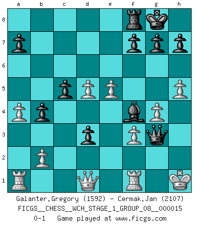 Last move : 0-1 2015 September 15 8:41:29 [Event "FICGS__CHESS__WCH_STAGE_1_GROUP_08__000015"] [Site "FICGS"] [Date "2015.07.02"] [Round "1"] [White "Galanter,Gregory"] [Black "Cermak,Jan"] [Result "0-1"] [WhiteElo "1592"] [BlackElo "2107"] 1.e4 e6 2.d3 d5 3.Nd2 c5 4.Ngf3 Nf6 5.g3 Nc6 6.Bg2 Be7 7.c3 O-O 8.O-O b5 9.a4 b4 10.c4 dxe4 11.Nxe4 Nxe4 12.dxe4 e5 13.Qc2 Bg4 14.Be3 Qd6 15.h3 Bh5 16.g4 Bg6 17.h4 Nd4 18.Bxd4 exd4 19.h5 d3 20.e5 Qc6 21.Qd2 Be4 22.Ne1 Bxg2 23.Nxg2 Rad8 24.Ne3 Qf3 25.Qd1 Qh3 26.f3 Bg5 27.Nd5 Qg3+ 28.Kh1 Rxd5 29.cxd5 Bf4 0-1 French : King's Indian attack Kingside Castling by player Black (move 7) Kingside Castling by player White (move 8) Player Black won this chess game. Follow this game move after move (download)If a ruler does not understand Chess, how can he rule over a kingdom ? (King Khusros II) Wie kann ich Remis annehmen? Ich weiß ja gar nicht, wie ich stehe! (Fritz Sämisch) Sin errores no puede haber brillantez. (Emanuel Lasker) Le temps de noter son nom sur la feuille de partie, j'étais déjà en zeitnot ! D'un modeste amateur apparié lors de la première ronde d'un open contre le grand-maître Azmaïparashvili. Hardware: the parts of a computer that can be kicked. (Jeff Persis)