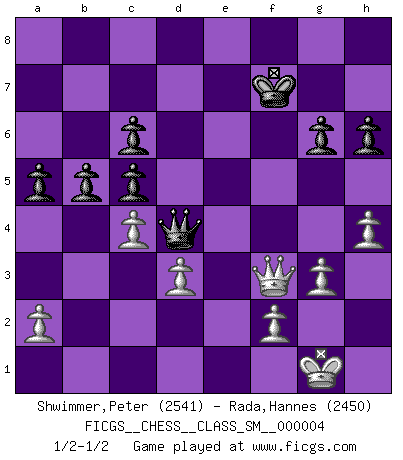 Last move : 1/2-1/2 2007 July 13 12:48:31 [Event "FICGS__CHESS__CLASS_SM__000004"] [Site "FICGS"] [Date "2007.03.06"] [Round "1"] [White "Shwimmer,Peter"] [Black "Rada,Hannes"] [Result "1/2-1/2"] [WhiteElo "2541"] [BlackElo "2450"] 1.e4 c5 2.Nf3 Nc6 3.Bb5 g6 4.O-O Bg7 5.Re1 Nf6 6.e5 Nd5 7.Nc3 Nc7 8.Bxc6 dxc6 9.Ne4 Ne6 10.d3 O-O 11.Be3 b6 12.Qd2 f5 13.exf6 exf6 14.Bh6 Ng5 15.Nxf6+ Qxf6 16.Bxg5 Qxb2 17.Bh6 Bd7 18.Bxg7 Qxg7 19.c3 Rae8 20.Rxe8 Rxe8 21.Re1 Qf6 22.c4 b5 23.h4 Qd6 24.Rxe8+ Bxe8 25.Qe2 Bf7 26.g3 a5 27.Ng5 h6 28.Nxf7 Kxf7 29.Qf3+ Qf6 30.Qe3 Qd4 31.Qf3+ 1/2-1/2 Sicilian : Nimzovich-Rossolimo attack (with ...g6, without ...d6) Kingside Castling by player White (move 4) Kingside Castling by player Black (move 10) This chess game ended in a draw. Follow this game move after move (download)Different people feel differently about resigning. (Bobby Fischer) Ein typischer, sehr verbreiteter Gedankenschädling ist der, daß der betreffende Amateur von der Annanhme ausgeht, daß jeder einzelne Zug etwas zu leisten habe. (Aaron Nimzowitsch) Desconfianza es la característica mas necesaria de un jugador de Ajedrez. (Siegbert Tarrasch) Des idées, des idées, j'en ai cent, j'en ai mille. Des bonnes, des mauvaises, applicables, irréalisables... Il suffit de faire le tri ! (Roos) For to win one hundred victories in one hundred battles is not the acme of skill. To subdue the enemy without fighting is the acme of skill. (Sun Tzu)