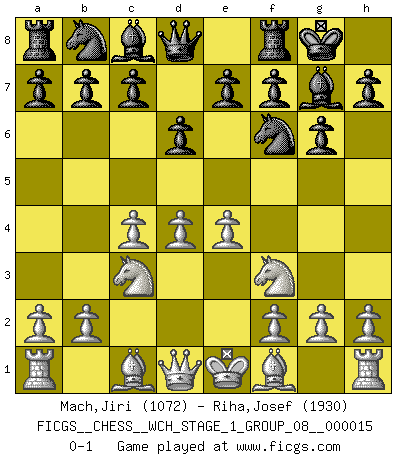 Last move : 0-1 2015 August 7 8:20:39 [Event "FICGS__CHESS__WCH_STAGE_1_GROUP_08__000015"] [Site "FICGS"] [Date "2015.07.02"] [Round "1"] [White "Mach,Jiri"] [Black "Riha,Josef"] [Result "0-1"] [WhiteElo "1072"] [BlackElo "1930"] 1.d4 Nf6 2.c4 g6 3.Nc3 Bg7 4.e4 d6 5.Nf3 O-O 0-1 This chess game has been lost on time (started : 2015.07.02 14:13:42) King's Indian : 5.Nf3 Kingside Castling by player Black (move 5) Player Black won this chess game. Follow this game move after move (download)I give 98 percent of my mental energy to Chess. Others give only 2 percent. (Bobby Fischer) Schach ist Leben. (Robert James Fischer) Aquel que teme a un Peón de Reina aislado, debería de retirarse del Ajedrez. (Siegbert Tarrasch) Les erreurs sont comme les malheurs, elles n'arrivent jamais seules. (Siegbert Tarrasch) Methinks King Thibault should dub Marius Zubac a knight of the square board... I mean table, henceforth addressing him as Sir Marius, and bestow on him a suitable land from the kingdom of FICGS & marry him off to a worthy, fair maiden, lest he slice our heads with his mighty sword in his wrath. (Dinesh De Silva)