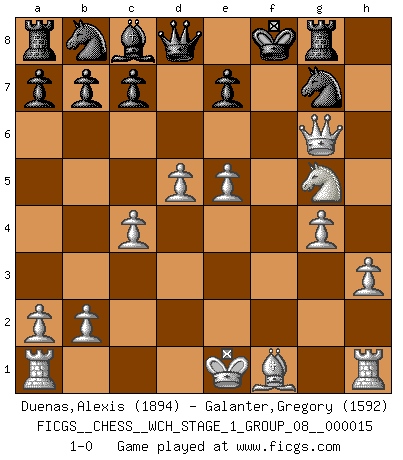 Last move : 1-0 2015 September 4 7:54:53 [Event "FICGS__CHESS__WCH_STAGE_1_GROUP_08__000015"] [Site "FICGS"] [Date "2015.07.02"] [Round "1"] [White "Duenas,Alexis"] [Black "Galanter,Gregory"] [Result "1-0"] [WhiteElo "1894"] [BlackElo "1592"] 1.d4 Nf6 2.c4 g6 3.Nc3 Bg7 4.e4 d6 5.f4 O-O 6.Nf3 Nc6 7.e5 dxe5 8.fxe5 Ng4 9.h3 Nh6 10.d5 Nb8 11.Bf4 Nf5 12.g4 Bh6 13.Qd2 Bxf4 14.Qxf4 Ng7 15.Qh6 f6 16.Ne4 Kf7 17.Qxh7 Rg8 18.Neg5+ Kf8 19.Qxg6 fxg5 20.Nxg5 1-0 King's Indian : Four pawns attack Kingside Castling by player Black (move 5) Player White won this chess game. Follow this game move after move (download)White lost because he failed to remember the right continuation and had to think up the moves himself. (Siegbert Tarrasch) Nicht daß Diemer aus Opportunismus Mitglied der NSDAP geworden wäre. Er war ein Fanatiker, in allem, was er tat. (Hans Ree) Un buen sacrificio es aquel que aunque no sea necesariamente sólido, deja a tu oponente aturdido y confuso. (Rudolph Spielmann) Vous m'avez demandé de vous exposer quel est le fondement de la prière. Je ne fais que préparer les pièces du jeu sur la table... Nous sera-t-il permis d'en adopter les règles et si nous les appliquons scrupuleusement nous ne tarderons pas à faire mat le Roi divin ! Il ne pourra échapper à nos mains. (Sainte Thérèse d'Avila, Chemin de perfection) Statistics can be made to prove anything - even the truth. (Author unknown)
