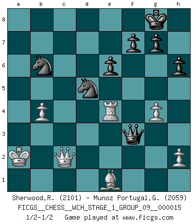 Last move : 1/2-1/2 2015 September 16 20:34:42 [Event "FICGS__CHESS__WCH_STAGE_1_GROUP_09__000015"] [Site "FICGS"] [Date "2015.07.02"] [Round "1"] [White "Sherwood,Russell"] [Black "Munoz Portugal,Guillermo"] [Result "1/2-1/2"] [WhiteElo "2101"] [BlackElo "2059"] 1.e4 c5 2.Nf3 d6 3.d4 cxd4 4.Nxd4 Nf6 5.Nc3 a6 6.Be3 e6 7.f3 b5 8.Qd2 Nbd7 9.O-O-O Bb7 10.a3 Rc8 11.g4 Nb6 12.Kb1 Nfd7 13.Rg1 Qc7 14.Ndxb5 axb5 15.Nxb5 Qc6 16.b3 d5 17.Na7 Qc7 18.Nxc8 Nxc8 19.Bb5 Bxa3 20.exd5 Bxd5 21.c4 Bc6 22.b4 Bxb5 23.cxb5 Ne7 24.Rge1 O-O 25.Qc2 Qb7 26.Qa4 Nd5 27.Qxa3 Ra8 28.Qb3 Qxb5 29.Bf2 h6 30.Re4 Rc8 31.Be1 Qb7 32.Qb2 N7b6 33.Rc1 Rxc1 34.Qxc1 Qa6 35.Qc2 Qf1 36.Ka2 Qxf3 1/2-1/2 Sicilian : Najdorf, Byrne (English) attack Queenside Castling by player White (move 9) Kingside Castling by player Black (move 24) This chess game ended in a draw. Follow this game move after move (download)The winner of the game is the player who makes the next-to-last mistake. (Savielly Tartakover) Wie gewinnt Tal? Er entwickelt alle seine Figuren in die Brettmitte und opfert sie dann irgendwo. (Robert James Fischer) No volvere nunca a jugar contigo. Has insultado a mi amigo. - cuando un oponente se maldijo por una mala jugada (Miguel Najdorf) Les Echecs ont trois composantes : le temps, l'espace et le matériel en dernier. (Mikhail Tal) Is not life a hundred times too short to bore ourselves ? (Friedrich Nietzsche)
