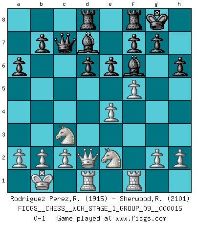Last move : 0-1 2015 August 31 22:13:25 [Event "FICGS__CHESS__WCH_STAGE_1_GROUP_09__000015"] [Site "FICGS"] [Date "2015.07.02"] [Round "1"] [White "Rodriguez Perez,Rene"] [Black "Sherwood,Russell"] [Result "0-1"] [WhiteElo "1915"] [BlackElo "2101"] 1.e4 c5 2.Nf3 d6 3.d4 cxd4 4.Qxd4 Nc6 5.Bb5 Bd7 6.Bxc6 Bxc6 7.Nc3 Nf6 8.Bg5 e6 9.O-O-O Be7 10.Rhe1 O-O 11.Kb1 Qc7 12.Qd2 Rfd8 13.Nd4 a6 14.f4 h6 15.Bxf6 Bxf6 16.f5 Bd7 17.Rf1 Rf8 18.Nde2 Rad8 0-1 This chess game has been lost on time (started : 2015.07.02 14:13:45) Sicilian, Chekhover variation Queenside Castling by player White (move 9) Kingside Castling by player Black (move 10) Player Black won this chess game. Follow this game move after move (download)At this time Fischer is simply a level above all the best Chessplayers in the world. (John Jacobs) Obwohl ich vom Stil her kaum zu den Priestern der Schachkunst gezählt werde, halte ich Schach doch für eine Kunst. (Tigran Petrosjan) La señal de un Gran Maestro es su habilidad de ganar una partida rápidamente y sin dolor. (Irving Chernev) Psychologiquement, tu dois avoir confiance en toi même, mais cette confiance doit être basée sur des faits. (Robert Fischer) The general who wins the battle makes many calculations in his temple before the battle is fought. The general who loses makes but few calculations beforehand. (Sun Tzu)