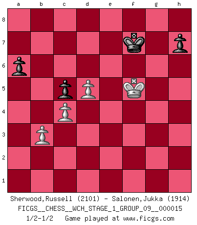 Last move : 1/2-1/2 2015 December 13 12:43:53 [Event "FICGS__CHESS__WCH_STAGE_1_GROUP_09__000015"] [Site "FICGS"] [Date "2015.07.02"] [Round "1"] [White "Sherwood,Russell"] [Black "Salonen,Jukka"] [Result "1/2-1/2"] [WhiteElo "2101"] [BlackElo "1914"] 1.e4 e5 2.Nf3 Nc6 3.Bb5 a6 4.Ba4 Nf6 5.O-O Be7 6.Re1 b5 7.Bb3 d6 8.c3 O-O 9.h3 Na5 10.Bc2 c5 11.d4 Qc7 12.d5 Bd7 13.b3 Nb7 14.c4 bxc4 15.bxc4 Na5 16.Na3 Rfb8 17.Bd2 Rb7 18.Rb1 R8a7 19.Bc3 Rxb1 20.Qxb1 Ra8 21.Bd3 Nb7 22.Qb2 Ra7 23.Nc2 Nd8 24.Ne3 Rb7 25.Qa3 Nh5 26.h4 g6 27.g3 Bf8 28.Qc1 Bh6 29.Qc2 f6 30.Qe2 Qc8 31.Nd2 Ba4 32.Rb1 Rxb1+ 33.Bxb1 Bd7 34.Qf3 Bxe3 35.Qxe3 Bh3 36.Bc2 Nf7 37.Bd1 Bg4 38.f3 Bd7 39.Qe1 Qf8 40.Nf1 Qg7 41.Qf2 Qh6 42.Qd2 Kf8 43.Qxh6+ Nxh6 44.Kf2 Nf7 45.Nd2 Ke7 46.Nb3 Ba4 47.Be2 Ng7 48.Bd3 g5 49.hxg5 fxg5 50.Be2 Nh5 51.f4 Nf6 52.Ke3 exf4+ 53.gxf4 gxf4+ 54.Kxf4 Nd7 55.Bh5 Nf8 56.Bxf7 Kxf7 57.e5 Ng6+ 58.Ke4 Nxe5 59.Bxe5 Bxb3 60.axb3 dxe5 61.Kxe5 Ke7 62.Kf5 Kf7 1/2-1/2 Ruy Lopez : Closed Kingside Castling by player White (move 5) Kingside Castling by player Black (move 8) 10 pieces endgame at move 60 : White KBPPP , Black KPPPP WHITE : King + 1 Bishop 3 Pawns BLACK : King + 4 Pawns 9 pieces endgame at move 60 : White KPPP , Black KPPPP WHITE : King + 3 Pawns BLACK : King + 4 Pawns 8 pieces endgame at move 61 : White KPPP , Black KPPP WHITE : King + 3 Pawns BLACK : King + 3 Pawns This chess game ended in a draw. Follow this game move after move (download)I love all positions. Give me a difficult positional game, I will play it. But totally won positions, I cannot stand them. (Hein Donner) Modernes Schach sorgt sich zuviel um Dinge wie Bauernstruktur usw. Vergessen Sie das, Schachmatt beendet das Spiel! (Nigel Short) Hay jugadores fuertes y personas amables y yo soy un jugador fuerte. (Bobby Fischer) Dans le domaine de la peinture, de la gravure et de la sculpture, dès la première décennie de notre siècle, les artistes abandonnent la représentation de la partie d'échecs pour se concentrer sur les pièces, sur les échiquiers et sur toutes les variations auxquelles les unes et les autres peuvent donner lieu. On passe en quelque sorte d'un thème social à un thème musical (au sens de la musica médiévale, c'est-à-dire d'une notion qui inclue le rythme, l'harmonie, la construction et la déconstruction, etc.). Graphiquement et picturalement, l'échiquier apparaît comme une structure ouverte, dynamique, d'une richesse infinie, autorisant toutes les combinatoires et débouchant sur des mouvements et des rythmes de nature exponentielle. (Michel Pastoureau) There are two major products that came out of Berkeley: LSD and UNIX. We do not believe this is to be a coincidence. (Jeremy S. Anderson)