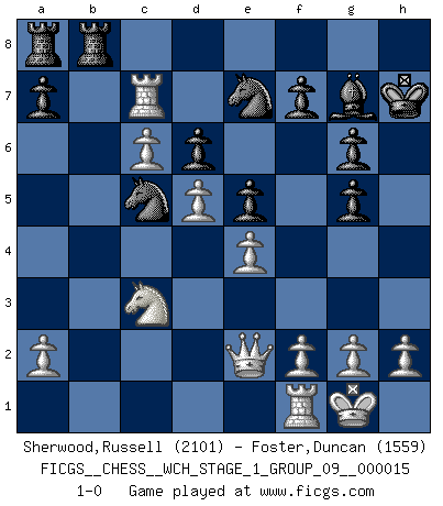 Last move : 1-0 2015 July 16 20:30:11 [Event "FICGS__CHESS__WCH_STAGE_1_GROUP_09__000015"] [Site "FICGS"] [Date "2015.07.02"] [Round "1"] [White "Sherwood,Russell"] [Black "Foster,Duncan"] [Result "1-0"] [WhiteElo "2101"] [BlackElo "1559"] 1.e4 e6 2.d4 b6 3.c4 Bb7 4.Bd3 g6 5.Nc3 Bg7 6.Nf3 h6 7.O-O Ne7 8.Be3 O-O 9.Qd2 Kh7 10.d5 e5 11.b4 d6 12.c5 bxc5 13.bxc5 Ba6 14.c6 Qc8 15.Bxa6 Nxa6 16.Rab1 Qg4 17.Rb7 Rfb8 18.Qe2 Nc5 19.Ng5+ Qxg5 20.Bxg5 hxg5 21.Rxc7 1-0 French defense Kingside Castling by player White (move 7) Kingside Castling by player Black (move 8) Player White won this chess game. Follow this game move after move (download)A great player and a great example for many. His book My 60 Memorable Games had a big impact on me. It is a shame he didn't continue to enrich the world of chess with his unparalleled understanding after 1972. (Jan Timman, about Bobby Fischer's death) Ja, ich habe einmal eine Blitzpartie gespielt, es war in einem Zug, 1929. --im Interview 1989 (Mikhail Moiseyevich Botvinik) Yo no creo en la psicología. Yo creo en las buenas movidas. (Bobby Fischer) On entre au jeu d'Echecs comme on entre en Religion. Pour le joueur d'Echecs, la partie d'Echecs c'est l'office, la messe, le défilé du 1er Mai, le dépôt de gerbe au Monument aux Morts. C'est un drame sacré. (Michel Roos) Memory is a complicated thing, a relative to truth, but not its twin. (Barbara Kingsolver, Animal Dreams)