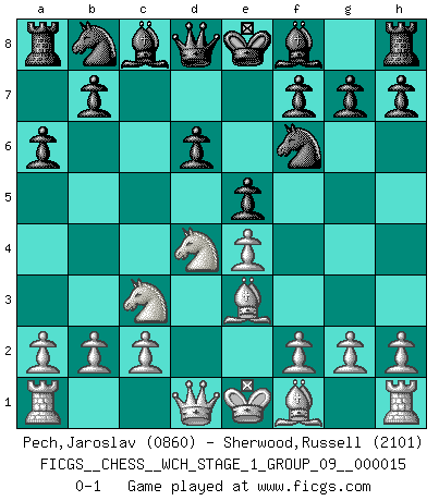 Last move : 0-1 2015 August 18 21:16:43 [Event "FICGS__CHESS__WCH_STAGE_1_GROUP_09__000015"] [Site "FICGS"] [Date "2015.07.02"] [Round "1"] [White "Pech,Jaroslav"] [Black "Sherwood,Russell"] [Result "0-1"] [WhiteElo "0860"] [BlackElo "2101"] 1.e4 c5 2.Nf3 d6 3.d4 cxd4 4.Nxd4 Nf6 5.Nc3 a6 6.Be3 e5 0-1 This chess game has been lost on time (started : 2015.07.02 14:13:45) Sicilian : Najdorf, Byrne (English) attack Player Black won this chess game. Follow this game move after move (download)By the beauty of his games, the clarity of his play, and the brilliance of his ideas, Fischer made himself an artist of the same stature as Brahms, Rembrandt, and Shakespeare. (David Levy) Wer mein Gambit spielt, muß bereit sein, alle Brücken hinter sich abzubrechen. Es verändert den ganzen Menschen. Es wirkt wie ein Zauberstab und fördert verkümmerte, gute Charakter- eigenschaften wieder zu Tage. (Emil Joseph Diemer) Me gusta decir que Bobby Fischer fue el mejor jugador que jamás haya existido. Pero lo que hizo de Fischer un genio, fue su habilidad de mezclar una frescura y pragmatismo Americano con ideas Rusas acerca de la estrategia. (Bruce Pandolfini) Je crois qu'il existe des manières très spécifiques de jouer efficacement contre une machine. Evidemment, nous n'avons aucune chance en technique pure, parce que l'ordinateur calcule de manière parfaite. Mais lorsque nous faisons appel à notre cerveau, en utilisant l'intuition et la compréhension, alors nous restons beaucoup plus forts. (Anatoli Karpov) Somehow our devils are never quite what we expect when we meet them face to face. (Nelson DeMille)