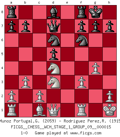 Last move : 1-0 2015 August 31 10:4:45 [Event "FICGS__CHESS__WCH_STAGE_1_GROUP_09__000015"] [Site "FICGS"] [Date "2015.07.02"] [Round "1"] [White "Munoz Portugal,Guillermo"] [Black "Rodriguez Perez,Rene"] [Result "1-0"] [WhiteElo "2059"] [BlackElo "1915"] 1.e4 e6 2.d4 d5 3.Nd2 c5 4.Ngf3 Nf6 5.exd5 exd5 6.Bb5 Bd7 7.Bxd7 Nbxd7 8.O-O Be7 9.dxc5 Nxc5 10.Nb3 Nce4 11.Nfd4 Qd7 12.f3 Nd6 13.Nc5 Qc8 14.Nd3 Qd7 15.g4 O-O 16.Kh1 Bd8 17.b3 1-0 This chess game has been lost on time (started : 2015.07.02 14:13:45) French : Tarrasch, Open variation Kingside Castling by player White (move 8) Kingside Castling by player Black (move 15) Player White won this chess game. Follow this game move after move (download)You need not play well - just help your opponent to play badly. (Genrikh Chepukaitis) Es ist nicht das erste mal, dass sich die FIDE dem Arabischen Geld gebeugt hat (über die FIDE WM 2004 in Lybien). (Larry Evans) Te sientas frente a un tablero y repentinamente tu corazón brinca. Tu mano tiembla al tomar una pieza y moverla. Pero lo que el Ajedrez te enseña es que tu debes permanecer ahí con calma y pensar de que si realmente es una buena idea o de que si hay otras ideas mejores. (Stanley Kubrick) Les Echecs ne sont pas pour les âmes timides. Ils requièrent un homme entier, qui ne s'arrête pas aveuglément à ce qui a été déjà établi, mais qui tente individuellement de sonder les profondeurs du jeu. (W. Steinitz) If you ain't just a little scared when you enter a casino, you are either very rich or you haven't studied the games enough. (Pappy)