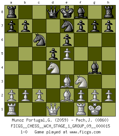 Last move : 1-0 2015 August 16 8:54:44 [Event "FICGS__CHESS__WCH_STAGE_1_GROUP_09__000015"] [Site "FICGS"] [Date "2015.07.02"] [Round "1"] [White "Munoz Portugal,Guillermo"] [Black "Pech,Jaroslav"] [Result "1-0"] [WhiteElo "2059"] [BlackElo "0860"] 1.e4 c6 2.d4 d5 3.e5 Bf5 4.Be2 e6 5.Nf3 c5 6.Be3 cxd4 7.Nxd4 Ne7 8.Nd2 Nbc6 9.N2f3 Bg4 10.O-O 1-0 This chess game has been lost on time (started : 2015.07.02 14:13:45) Caro-Kann : Advance variation Kingside Castling by player White (move 10) Player White won this chess game. Follow this game move after move (download)I like the moment when I break a man's ego. (Bobby Fischer) Unter Putin wird alles Geld aus Russland wie von einem Staubsauger nach Moskau umgeleitet, das ist wie ein schwarzes Loch. (Garry Kasparov) El Peón aislado arroja penumbra sobre todo el tablero. (Aaron Nimzovich) Tous ces prétendus hommes politiques sont les pions, les Cavaliers, les Tours ou les Fous d'une partie d'échecs qui se jouera tant qu'un hasard ne renversera pas l'échiquier. (Honoré de Balzac) Life doesn't imitate art, it imitates bad television. (Woody Allen)