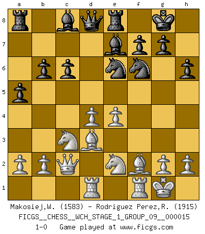 Last move : 1-0 2015 September 9 10:53:3 [Event "FICGS__CHESS__WCH_STAGE_1_GROUP_09__000015"] [Site "FICGS"] [Date "2015.07.02"] [Round "1"] [White "Makosiej,Wladyslaw"] [Black "Rodriguez Perez,Rene"] [Result "1-0"] [WhiteElo "1583"] [BlackElo "1915"] 1.d4 d5 2.c4 e6 3.Nc3 Nf6 4.cxd5 exd5 5.Bg5 Nbd7 6.e3 c6 7.Qc2 Be7 8.Bd3 O-O 9.Nge2 Re8 10.O-O Nf8 11.f3 h6 12.Bh4 a5 13.Rad1 Ne6 14.Bf2 b6 15.e4 dxe4 16.fxe4 1-0 This chess game has been lost on time (started : 2015.07.02 14:13:45) QGD : Exchange, positional line Kingside Castling by player Black (move 8) Kingside Castling by player White (move 10) Player White won this chess game. Follow this game move after move (download)By the beauty of his games, the clarity of his play, and the brilliance of his ideas, Fischer made himself an artist of the same stature as Brahms, Rembrandt, and Shakespeare. (David Levy) Rubinstein ist ein Turmendspiel, welches die Götter vor tausenden von Jahren begannen. (Savielly Grigorievitsch Tartakower) Cuando veas una buena jugada, trata de encontrar otra mejor. (Emanuel Lasker) Le jeu d'échecs est comme rejeté hors du temps. (Antoine de Saint-Exupéry) When you've done things right people won't know you've done anything at all. (Futurama)