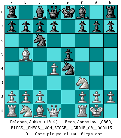 Last move : 1-0 2015 August 15 20:44:59 [Event "FICGS__CHESS__WCH_STAGE_1_GROUP_09__000015"] [Site "FICGS"] [Date "2015.07.02"] [Round "1"] [White "Salonen,Jukka"] [Black "Pech,Jaroslav"] [Result "1-0"] [WhiteElo "1914"] [BlackElo "0860"] 1.e4 e5 2.Nf3 Nc6 3.Bb5 Nf6 4.O-O Nxe4 5.d4 1-0 This chess game has been lost on time (started : 2015.07.02 14:13:45) Ruy Lopez : Berlin defense, Open variation Kingside Castling by player White (move 4) Player White won this chess game. Follow this game move after move (download)Chess is the art of analysis. (Mikhail Botvinnik) Frage des Reporters: -Worin besteht das Ziel von Gambiteröffnungen? Antwort: -Auf Kosten der Partie einen Ruf als Angriffspieler zu erwerben.- (Siegbert Tarrasch) Hay jugadores fuertes y personas amables y yo soy un jugador fuerte. (Bobby Fischer) Pour se monter efficace, un Cavalier a besoin d'avant-postes ! Les Cavaliers font les meilleurs bloqueurs de pions passés. There's no money in correspondence chess. (John Knudsen)