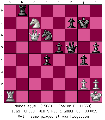 Last move : 0-1 2015 November 10 18:49:30 [Event "FICGS__CHESS__WCH_STAGE_1_GROUP_09__000015"] [Site "FICGS"] [Date "2015.07.02"] [Round "1"] [White "Makosiej,Wladyslaw"] [Black "Foster,Duncan"] [Result "0-1"] [WhiteElo "1583"] [BlackElo "1559"] 1.d4 e6 2.c4 b6 3.e4 Bb7 4.Bd3 g6 5.Nc3 Bg7 6.Be3 d6 7.Qd2 h6 8.Nge2 Ne7 9.O-O Nd7 10.Rac1 g5 11.f4 g4 12.d5 e5 13.f5 Nf6 14.b4 a6 15.c5 h5 16.cxb6 cxb6 17.a4 Rc8 18.Nb1 Neg8 19.Na3 Bh6 20.Nc4 b5 21.axb5 axb5 22.Na3 Bxe3+ 23.Qxe3 Ne7 24.Nxb5 Ba6 25.Rxc8 Nxc8 26.Ra1 Bxb5 27.Bxb5+ Ke7 28.Bc6 Nd7 29.Ra8 Rg8 30.Bxd7 Kxd7 31.b5 Qh4 32.Ng3 Qg5 33.Qa3 Qd2 34.Nf1 Qd4+ 35.Kh1 Qxe4 36.Qc3 Qxd5 37.Qa5 Qc4 38.Qa1 Qxb5 39.Ra5 Qd3 40.Ra3 Qxf5 41.Ne3 Qe6 42.Ra8 Rd8 43.Qa4+ Ke7 44.Qe4 d5 45.Qb4+ Kf6 46.Qb7 d4 47.Ra6 Nd6 48.Nd5+ Kg7 49.Qc6 Rc8 50.Nc7 Qf5 51.Ra1 Rb8 0-1 Queen's pawn : Keres defense Kingside Castling by player White (move 9) Player Black won this chess game. Follow this game move after move (download)Nothing excites jaded Grandmasters more than a theoretical novelty. (Dominic Lawson) Später, ... hatte ich zunehmend Erfolg in entscheidenden Partien. Vielleicht weil ich eine einfache Wahrheit erkannte: nicht nur ich hatte Angst, auch mein Gegner. (Mikhail Nekhemyevich Tal) Tu puedes aprender mucho mas de una partida que pierdas que de una partida ganada. Tendras que perder cientos de partidas antes de llegar a ser un buen jugador. (Jose Raul Capablanca) Assurément je connaissais par expérience le mystérieux attrait de ce jeu royal, le seul entre tous les jeux inventés par les hommes qui échappe souverainement à la tyrannie du hasard, le seul où l'on ne doive sa victoire qu'à son intelligence ou plutôt à une certaine forme d'intelligence. Mais n'est-ce pas déjà le limiter injurieusement que d'appeler les échecs un jeu ? N'est-ce pas une science, un art ou quelque chose qui, comme le cercueil de Mahomet entre ciel et terre, est suspendu entre l'un et l'autre, et qui réunit un nombre incroyable de contraires ? [...] C'est une pensée qui ne mène à rien, une mathématique qui n'établit rien, un art qui ne laisse pas d'uvre, une architecture sans matière; et il l'a prouvé néanmoins qu'il était plus durable, à sa manière, que les livres ou que tout autre monument, ce jeu unique qui appartient à tous les peuples et à tous les temps, et dont personne ne sait quel dieu en fit don à la terre pour tuer l'ennui, pour aiguiser l'esprit et stimuler l'âme. Où commence-t-il, où finit-il ? (Stefan Zweig) Men should grow up. - Yeah. And dogs should stop licking themselves. It's not gonna happen. (Gregory House to Dr. Cameron, House M.D.)