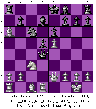 Last move : 1-0 2015 August 17 9:1:34 [Event "FICGS__CHESS__WCH_STAGE_1_GROUP_09__000015"] [Site "FICGS"] [Date "2015.07.02"] [Round "1"] [White "Foster,Duncan"] [Black "Pech,Jaroslav"] [Result "1-0"] [WhiteElo "1559"] [BlackElo "0860"] 1.e4 e6 2.d4 d5 3.e5 c5 4.c3 Nc6 5.Nf3 Qb6 6.Bd3 cxd4 7.cxd4 Bd7 8.O-O Nxd4 9.Nxd4 Qxd4 10.Nc3 a6 11.Qe2 Ne7 12.Rd1 Nc6 13.Bxa6 1-0 This chess game has been lost on time (started : 2015.07.02 14:13:45) French : Advance, Milner-Barry gambit Kingside Castling by player White (move 8) Player White won this chess game. Follow this game move after move (download)One doesn't have to play well, it's enough to play better than your opponent. (Siegbert Tarrasch) Es war undenkbar für die Behörden, dass ein sowjetischer Großmeister auf diese Art und Weise [Fischer-Taimanov 6:0] verliert, ohne dass es eine politischer Erklärung dafür gäbe. (Mark Taimanov) Yo siempre he tenido un ligero sentimiento de lástima por una persona que no tiene conocimiento del Ajedrez. (Siegbert Tarrasch) Celui qui prend des risques peut perdre, celui qui n'en prend pas perd toujours. (Xavier Tartacover) The only sure thing about luck is that it will change. (Wilson Mizner)