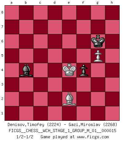 Last move : 1/2-1/2 2016 February 20 9:56:12 [Event "FICGS__CHESS__WCH_STAGE_1_GROUP_M_01__000015"] [Site "FICGS"] [Date "2015.07.02"] [Round "1"] [White "Denisov,Timofey"] [Black "Gazi,Miroslav"] [Result "1/2-1/2"] [WhiteElo "2224"] [BlackElo "2268"] 1.d4 f5 2.g3 Nf6 3.Nf3 g6 4.Bg2 Bg7 5.c4 O-O 6.O-O d6 7.Nc3 c6 8.Qc2 Na6 9.Bd2 Qe8 10.Qb3 e5 11.c5 Be6 12.Qxb7 Bc4 13.cxd6 Rf7 14.d7 Rxd7 15.Qxc6 Rc8 16.Qa4 exd4 17.Nb5 R7d8 18.Qxa6 Qxb5 19.Qxb5 Bxb5 20.Ba5 Bxe2 21.Rfe1 d3 22.Bxd8 Rxd8 23.Ng5 Bh6 24.Ne6 Rd6 25.Nc5 Bd2 26.Red1 Bb4 27.Nb3 d2 28.Bf1 Bxd1 29.Rxd1 Ne4 30.Bc4+ Kg7 31.Kf1 Nc5 32.Nxc5 Bxc5 33.f4 Rd4 34.Bb3 Kh6 35.Bc2 Kh5 36.h3 Rd7 37.Kg2 Kh6 38.Kf3 Kg7 39.Ke2 Re7+ 40.Kxd2 h5 41.Kc3 Bf2 42.Rd3 Be1+ 43.Kb3 Rb7+ 44.Ka3 h4 45.gxh4 Bxh4 46.b3 Be7+ 47.Kb2 Bc5 48.Rf3 Kf6 49.Kc3 Bb4+ 50.Kd4 Bd2 51.Bb1 Rb4+ 52.Kd5 Rxf4 53.Rxf4 Bxf4 54.Bd3 Be3 55.Bb5 Kg5 56.Be8 Bd2 57.Bf7 Bb4 58.Ke5 Bc5 59.Kd5 Bf8 60.Be8 Bb4 61.Kd4 Ba3 62.Kd5 a5 63.Ke5 Bb2+ 64.Kd5 Kh5 65.Bf7 Ba3 66.Ke5 Bb4 67.Kd5 Kg5 68.Ke5 Bc3+ 69.Kd5 Kf6 70.Be8 g5 71.Bh5 Bb4 72.Be2 Ba3 73.Bd1 Bb2 74.Be2 Bc1 75.Kd6 f4 76.Kd5 Bb2 77.Ke4 Be5 78.a3 Bd6 79.b4 axb4 80.axb4 Bxb4 81.h4 Kg6 82.hxg5 1/2-1/2 Dutch defense Kingside Castling by player Black (move 5) Kingside Castling by player White (move 6) 10 pieces endgame at move 53 : White KBPPP , Black KBPPP WHITE : King + 1 Bishop 3 Pawns BLACK : King + 1 Bishop 3 Pawns 9 pieces endgame at move 79 : White KBPP , Black KBPPP WHITE : King + 1 Bishop 2 Pawns BLACK : King + 1 Bishop 3 Pawns 8 pieces endgame at move 80 : White KBPP , Black KBPP WHITE : King + 1 Bishop 2 Pawns BLACK : King + 1 Bishop 2 Pawns 7 pieces endgame at move 80 : White KBP , Black KBPP WHITE : King + 1 Bishop 1 Pawn BLACK : King + 1 Bishop 2 Pawns 6 pieces endgame at move 82 : White KBP , Black KBP WHITE : King + 1 Bishop 1 Pawn BLACK : King + 1 Bishop 1 Pawn This chess game ended in a draw. Follow this game move after move (download)The older I grow, the more I value pawns. (Paul Keres) Ich spiele 70 Eröffnungssysteme. (Viktor Kortschnoi) Mis oponentes también hacen buenas movidas. A veces yo no tomo esas cosas en consideración. (Bobby Fischer) Dans le domaine de la peinture, de la gravure et de la sculpture, dès la première décennie de notre siècle, les artistes abandonnent la représentation de la partie d'échecs pour se concentrer sur les pièces, sur les échiquiers et sur toutes les variations auxquelles les unes et les autres peuvent donner lieu. On passe en quelque sorte d'un thème social à un thème musical (au sens de la musica médiévale, c'est-à-dire d'une notion qui inclue le rythme, l'harmonie, la construction et la déconstruction, etc.). Graphiquement et picturalement, l'échiquier apparaît comme une structure ouverte, dynamique, d'une richesse infinie, autorisant toutes les combinatoires et débouchant sur des mouvements et des rythmes de nature exponentielle. (Michel Pastoureau) The mind is like a parachute, it only functions when its open. (Unknown)