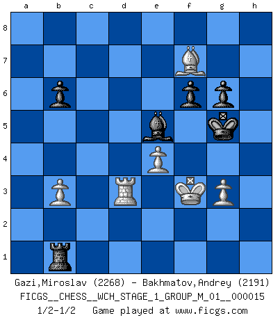 Last move : 1/2-1/2 2015 November 8 19:26:49 [Event "FICGS__CHESS__WCH_STAGE_1_GROUP_M_01__000015"] [Site "FICGS"] [Date "2015.07.02"] [Round "1"] [White "Gazi,Miroslav"] [Black "Bakhmatov,Andrey"] [Result "1/2-1/2"] [WhiteElo "2268"] [BlackElo "2191"] 1.d4 Nf6 2.Bg5 c5 3.d5 Ne4 4.Bf4 Qb6 5.Bc1 e6 6.f3 Qa5+ 7.c3 Nf6 8.e4 d6 9.Bd2 exd5 10.c4 Qd8 11.cxd5 g6 12.Bd3 Bg7 13.Bc3 O-O 14.Ne2 Nbd7 15.a4 Ne5 16.Bxe5 dxe5 17.Qc2 b6 18.a5 Bd7 19.Na3 Bh6 20.O-O Ne8 21.axb6 axb6 22.Nc3 Be3+ 23.Kh1 Nd6 24.Nab5 Bxb5 25.Nxb5 Nxb5 26.Bxb5 Bd4 27.Rxa8 Qxa8 28.Rb1 Qa5 29.Qd3 Qb4 30.b3 Ra8 31.Qc4 Qd2 32.Ba4 Be3 33.Qf1 Kf8 34.Rd1 Qc2 35.Ra1 Kg7 36.d6 c4 37.Qxc4 Qd2 38.Qf1 Qxd6 39.Bb5 Rc8 40.Bc4 Rc7 41.Rd1 Bd4 42.Qd3 Qf6 43.Rf1 Rc5 44.Qe2 h5 45.Qd2 Rc7 46.g3 h4 47.Kg2 Qd8 48.f4 Qa8 49.Qd3 Qc8 50.fxe5 Bxe5 51.Qd5 f6 52.Qe6 Qxe6 53.Bxe6 hxg3 54.hxg3 Kh6 55.Rf3 Rc1 56.Rd3 Kg5 57.Kf2 Rc2+ 58.Kf3 Rb2 59.Bf7 Rb1 1/2-1/2 Trompowsky attack (Ruth, Opovcensky Opening) Kingside Castling by player Black (move 13) Kingside Castling by player White (move 20) This chess game ended in a draw. Follow this game move after move (download)I feel as if I were a piece in a game of Chess, when my opponent says of it: That piece cannot be moved. (Soren Kierkegaard) Ich trinke, ich rauche, ich spiele, ich liebe Frauen aber Fernschach ist ein Laster, das ich nicht habe. (Mikhail Nekhemyevich Tal) El Peón aislado arroja penumbra sobre todo el tablero. (Aaron Nimzovich) En blitz, le Cavalier l'emporte sur le Fou. (Vlastimil Hort) Inventor: A person who makes an ingenious arrangement of wheels, levers and springs, and believes it civilization. (Ambrose Bierce, The Devil's Dictionary)