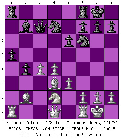 Last move : 0-1 2015 September 6 22:33:19 [Event "FICGS__CHESS__WCH_STAGE_1_GROUP_M_01__000015"] [Site "FICGS"] [Date "2015.07.02"] [Round "1"] [White "Sinsuat,Datuali"] [Black "Moormann,Joerg"] [Result "0-1"] [WhiteElo "2224"] [BlackElo "2179"] 1.d4 d5 2.c4 e6 3.Nf3 c6 4.Nc3 dxc4 5.a4 Bb4 6.e3 b5 7.Bd2 a5 8.axb5 Bxc3 9.Bxc3 cxb5 10.b3 Bb7 11.bxc4 b4 12.Bb2 Nf6 13.Bd3 Nbd7 14.O-O O-O 15.Nd2 Qc7 0-1 Queen's gambit declined Kingside Castling by player White (move 14) Kingside Castling by player Black (move 14) Player Black won this chess game. Follow this game move after move (download)The tactician must know what to do whenever something needs doing; the strategist must know what to do when nothing needs doing. (Savielly Tartakover) Was ist der Unterschied zwischen einem Strassenarbeiter und einem Schachspieler? --Der Schachspieler bewegt sich ab und zu. (Anonymous) Uno no tiene que jugar muy bien, es suficiente jugar mejor que el oponente. (Siegbert Tarrasch) Je ne suis pas le dernier à jouer lâchement des coups douteux pendant le zeïtnot de l'adversaire pour l'achever: en effet les coups qui font le plus peur sont ceux que l'on ne comprend pas. Je me fais souvent peur quand je joue. (Un professeur anonyme) I don't believe in psychology. I believe in good moves. (Bobby Fischer)