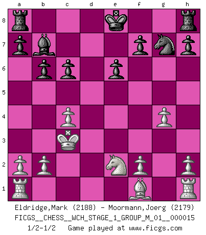 Last move : 1/2-1/2 2015 August 14 22:48:8 [Event "FICGS__CHESS__WCH_STAGE_1_GROUP_M_01__000015"] [Site "FICGS"] [Date "2015.07.02"] [Round "1"] [White "Eldridge,Mark"] [Black "Moormann,Joerg"] [Result "1/2-1/2"] [WhiteElo "2188"] [BlackElo "2179"] 1.d4 d5 2.c4 e6 3.Nc3 c6 4.e4 dxe4 5.Nxe4 Bb4+ 6.Bd2 Qxd4 7.Bxb4 Qxe4+ 8.Ne2 Na6 9.Bf8 Ne7 10.Bxg7 Nb4 11.Qd6 Nd3+ 12.Kd2 Nf5 13.Qxd3 Qxd3+ 14.Kxd3 Nxg7 15.Kc3 b6 16.g4 Bb7 1/2-1/2 QGD : Semi-Slav, Marshall gambit This chess game ended in a draw. Follow this game move after move (download)I prefer to lose a really good game than to win a bad one. (David Levy) Schach ist Krieg, im Schach geht es um testosterongesteuerte Urschreie. (Garry Kasparov) La vida es como un juego de Ajedrez, cambiando con cada movimiento. (Proverbio Chino) Les Echecs sont affaire de jugement sensible. Savoir quand frapper et quand esquiver. (Fischer) All the troubles of the world come from being unable to sit alone in a quiet room. (Blaise Pascal)
